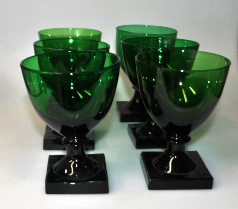Gorm den Gamle vin glas, 19. årh. Hel grønt glas. Firkantet presset fod med mønster under bund og kugleslibning. Højde.: ca. 12,5 cm. Forskellige højder.