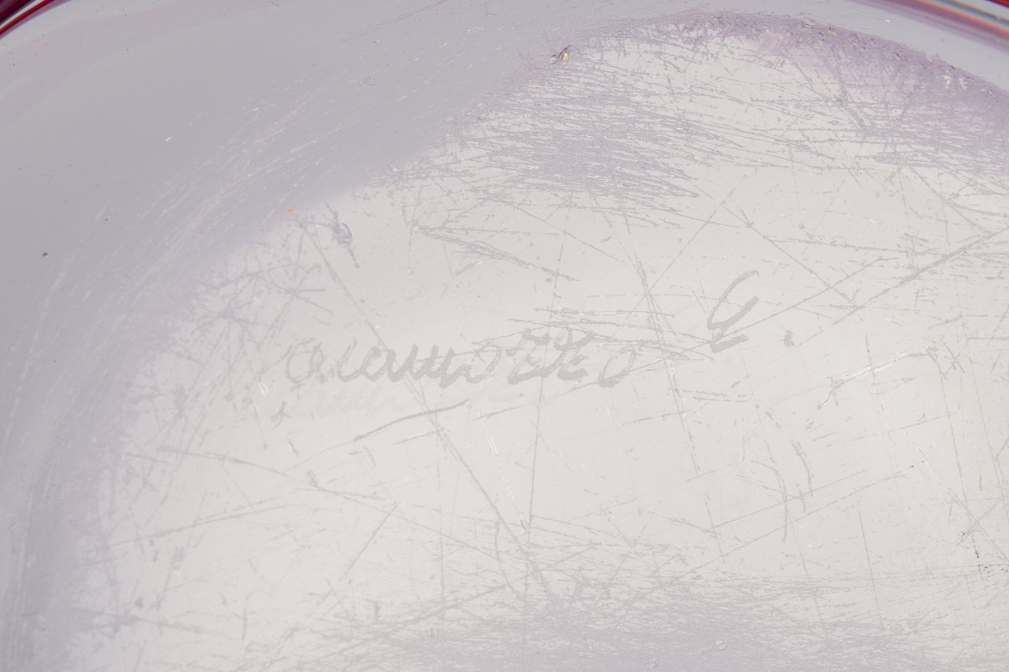 Kolossal unika bordskål af glas, prydet med horisontale røde glasdekorationer i relief. Håndlavet.