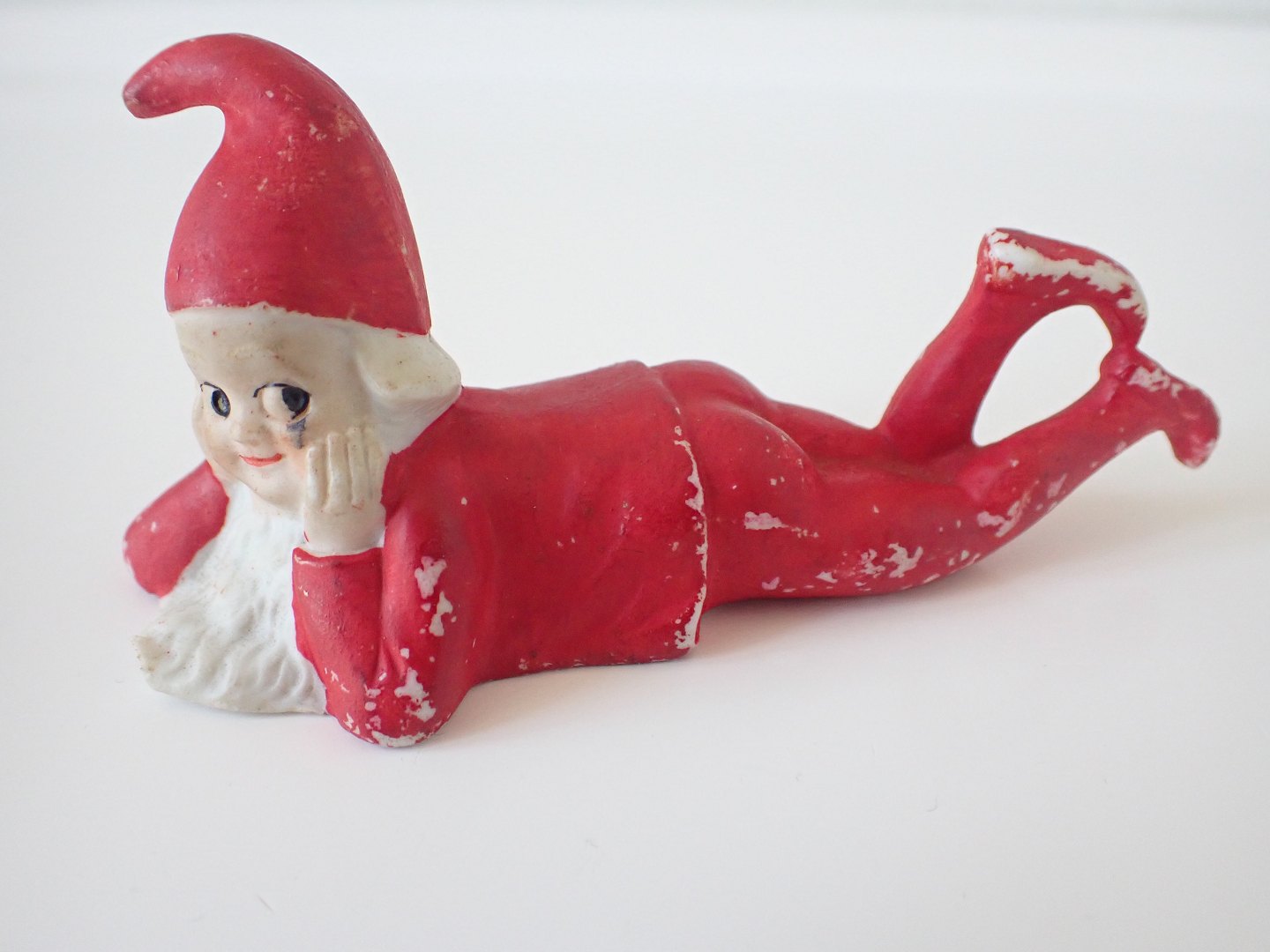 En stor liggende håndmalet biscuit nisse. Tyskland ca. 1930. Længde: 10,5 cm. Højde: 5 cm. I flot tidtypisk stand. Pris. 600 kr.