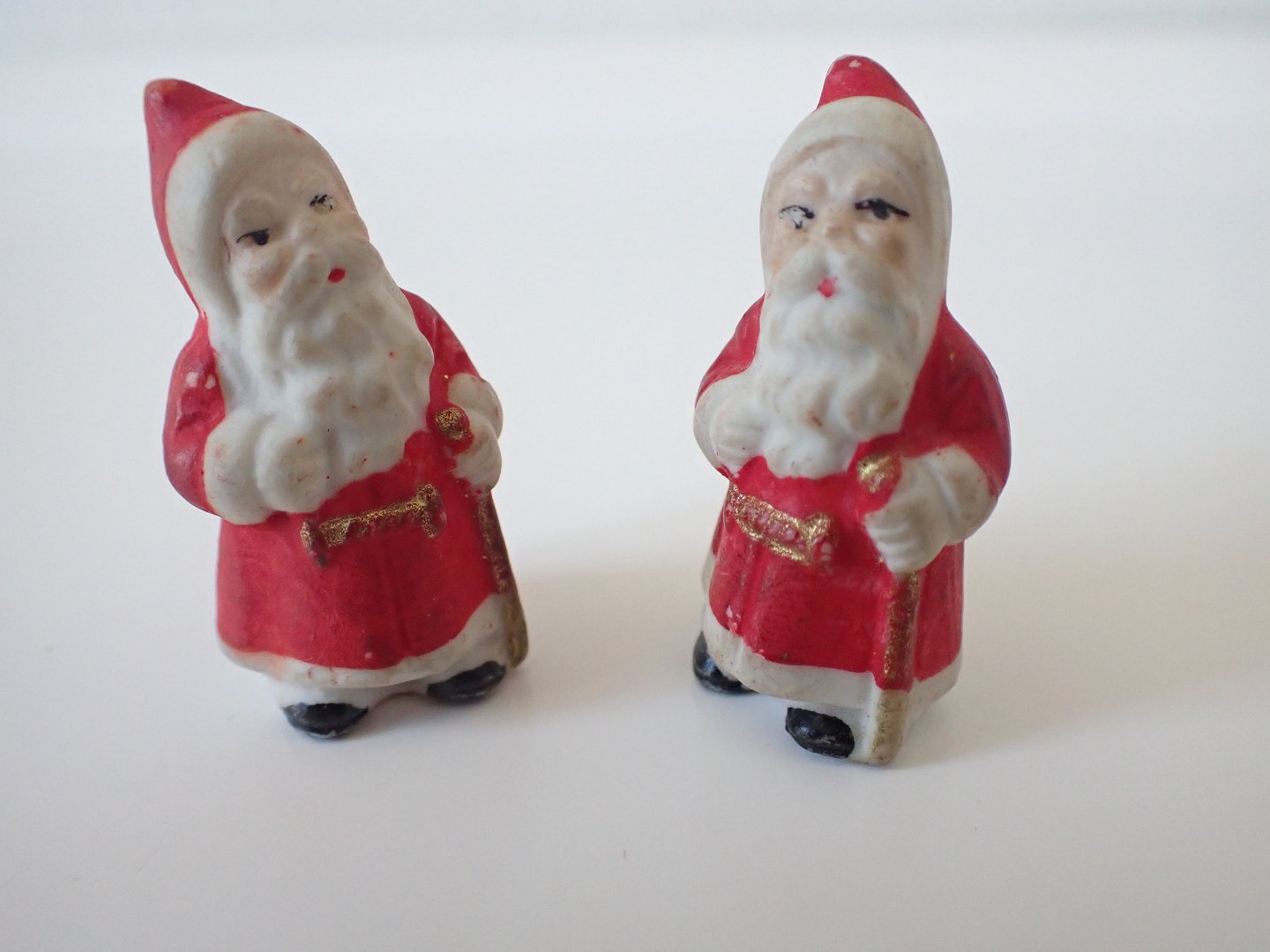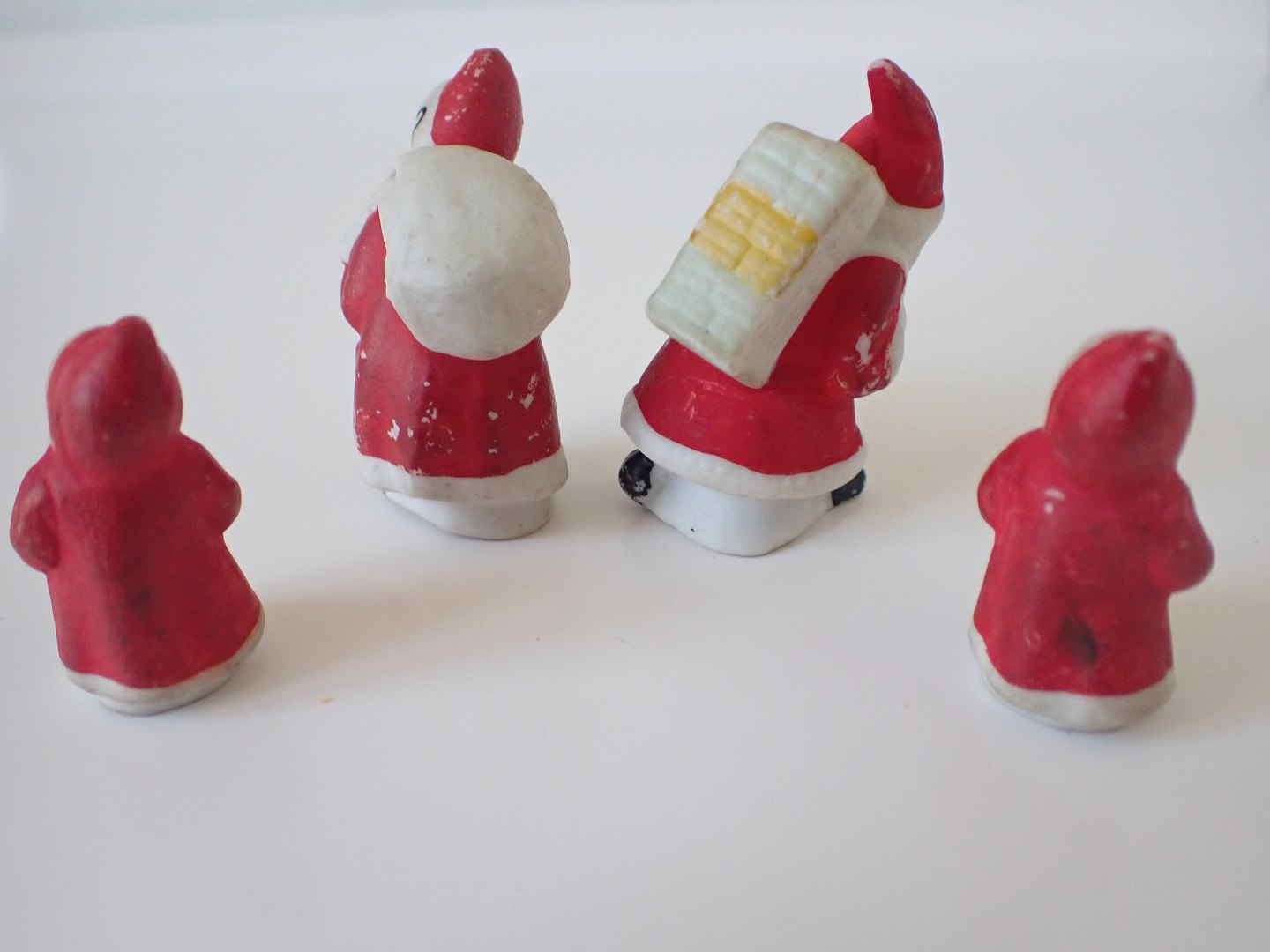 Text zugänglich auf Dänische: 4 håndmalede tyske biscuit julemænd 2 med gavesække på ryggen og 2 uden.. Ca. 1930. Højde: 2 stk. på 3,8 til 250 kr. pr. stk. og 2 stk. 5 cm. til 300 kr. pr. stk. I pæn tidstypisk stand.