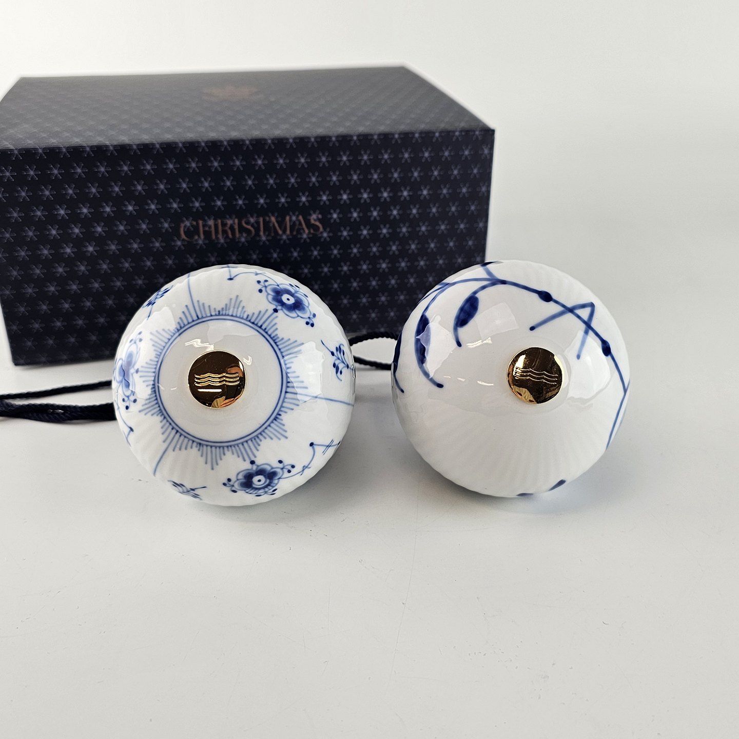 Julekugler af porcelæn med mussel malet riflet og blå mega mussel malet mønster.