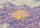 Vævet med geometriske felter i forskellige farver på blå og grøn bund.