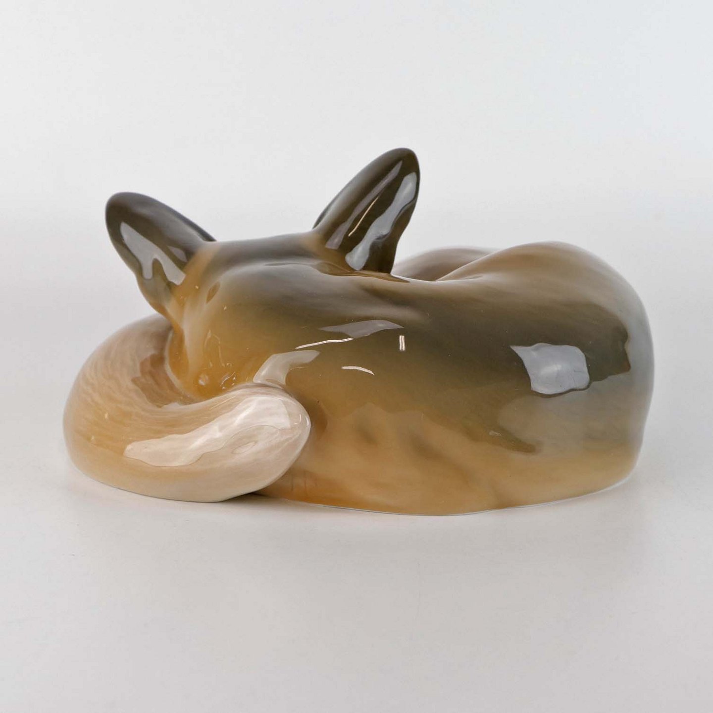 Figur i porcelæn med motiv af hvilende sammerullet ræv. Nr. 438