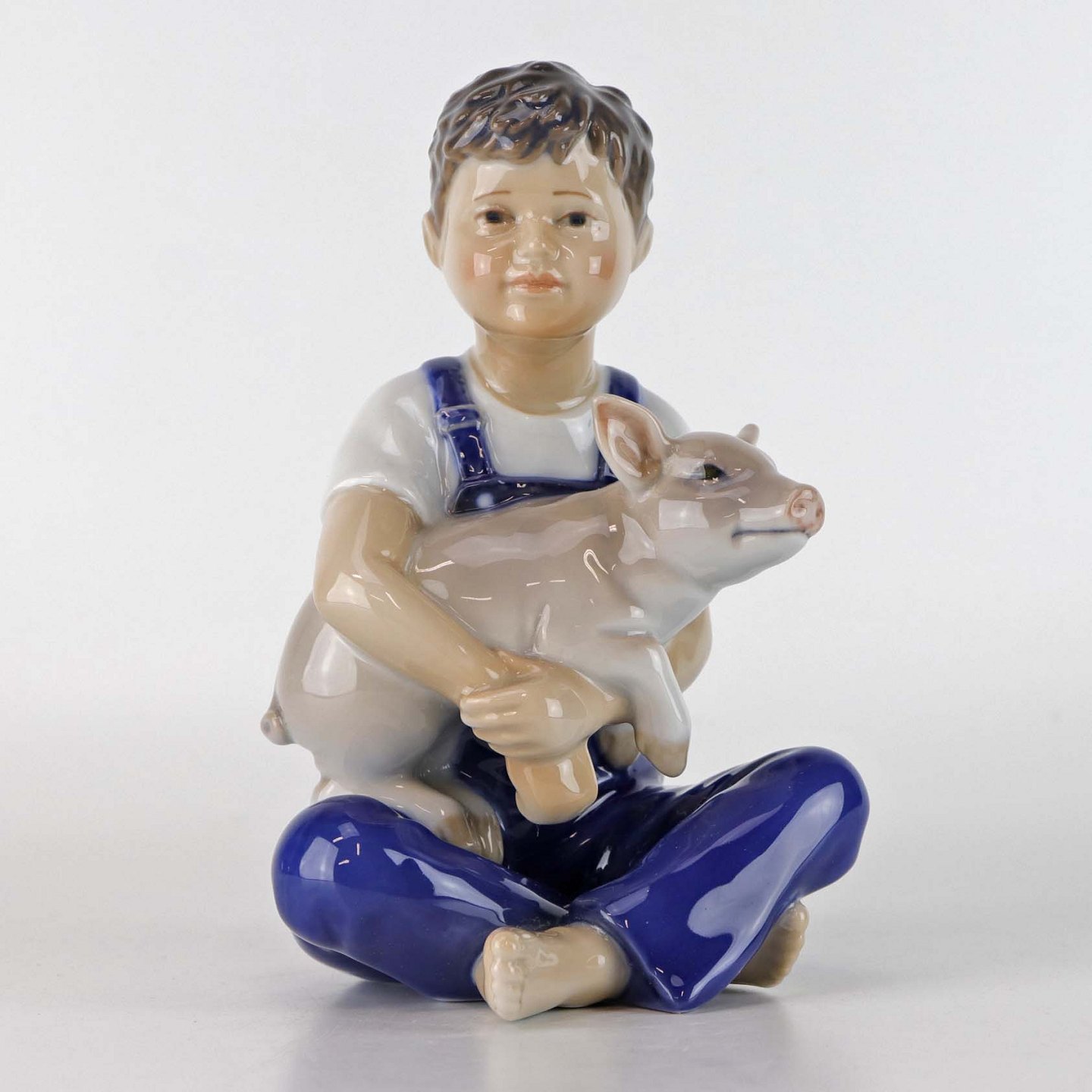 Figur i porcelæn med motiv af en lille gris i armene på en siddende dreng. Nr. 735