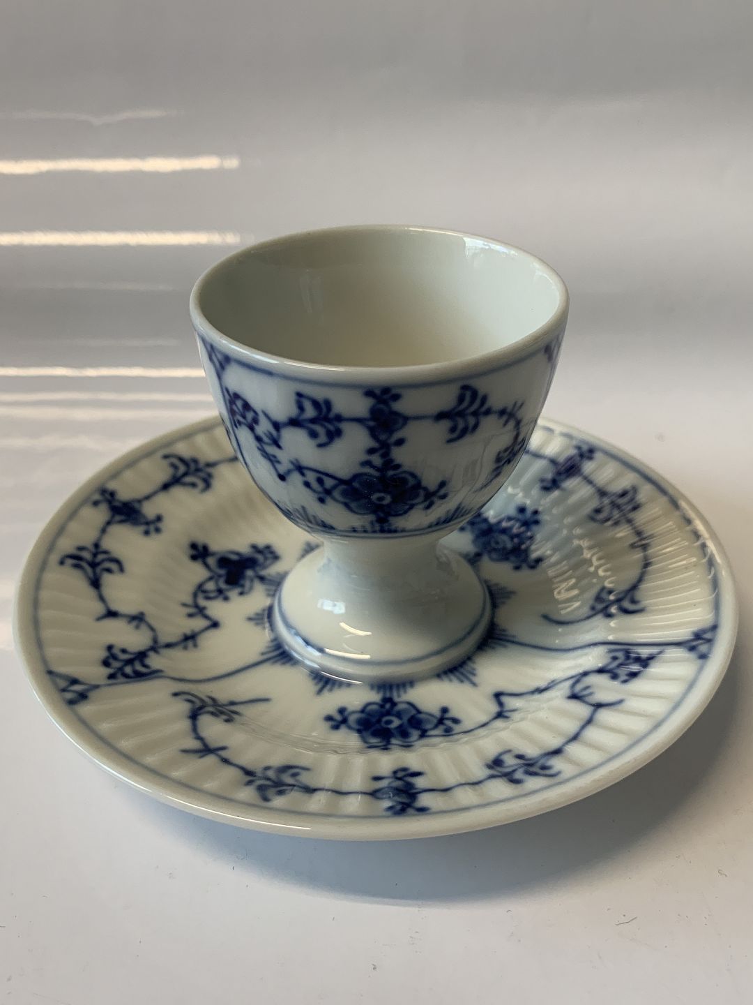 Royal Copenhagen musselmalet riflet æggeholder med undertallerken.