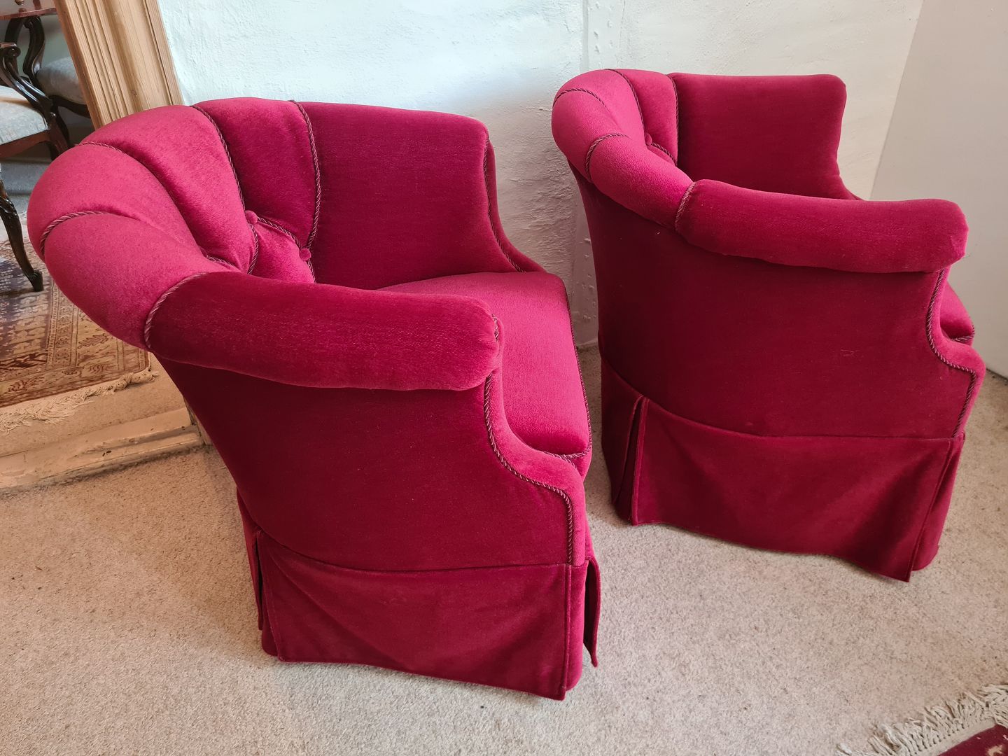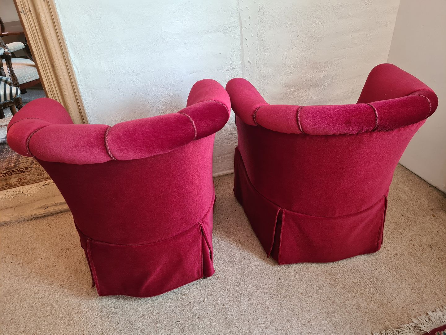 Par lænestole fra 1950'erne overbetrukket med rødt velour. Fremstår pæne og velholdte uden nævneværdige brugsspor.