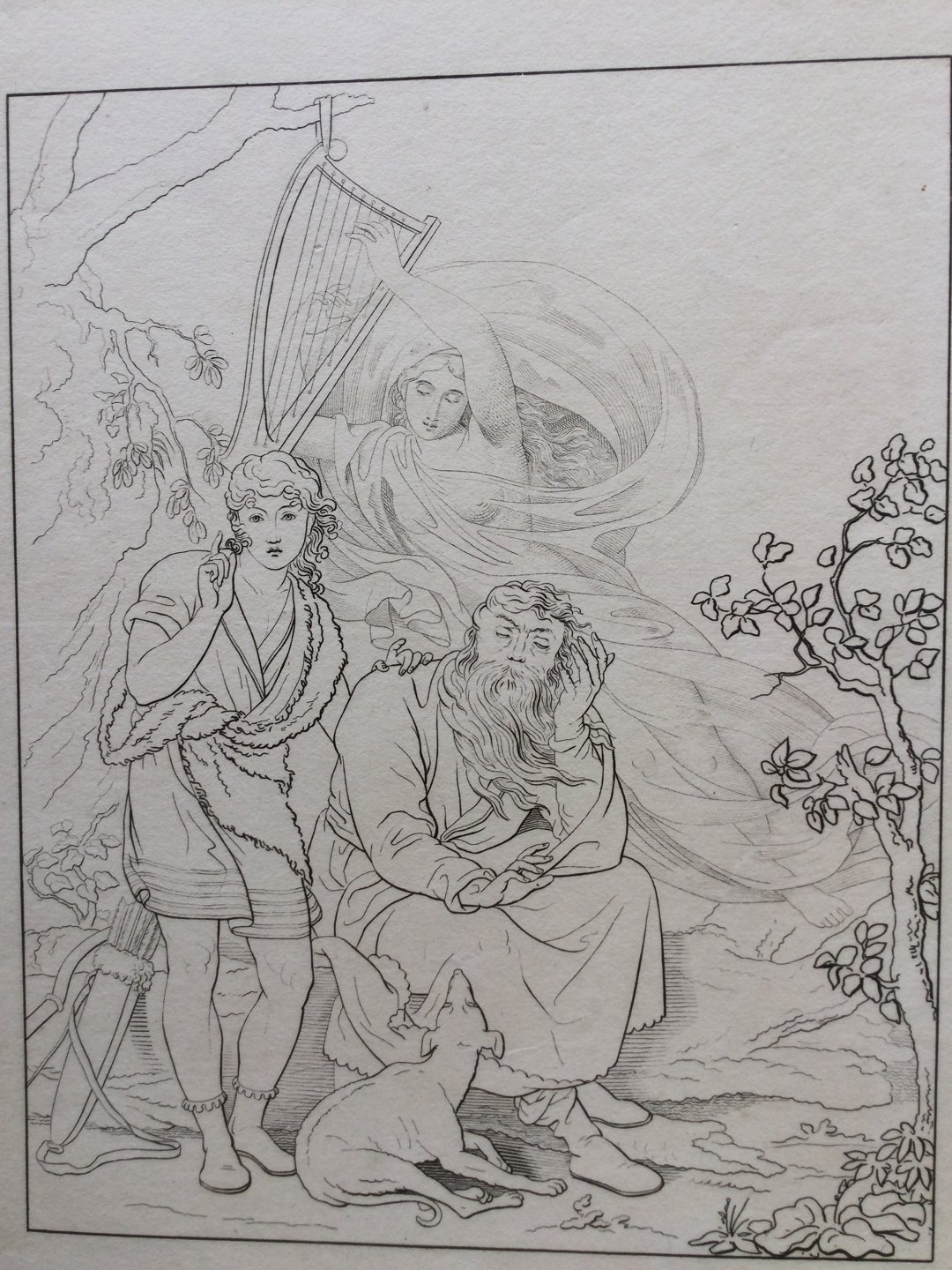 Text zugänglich auf Dänische: Radering efter C.G. Kratzenstein-Stubs "Ossian og Alpins Søn hører Malvinas Ånd gribe i Harpens Strenge" fra 1815.