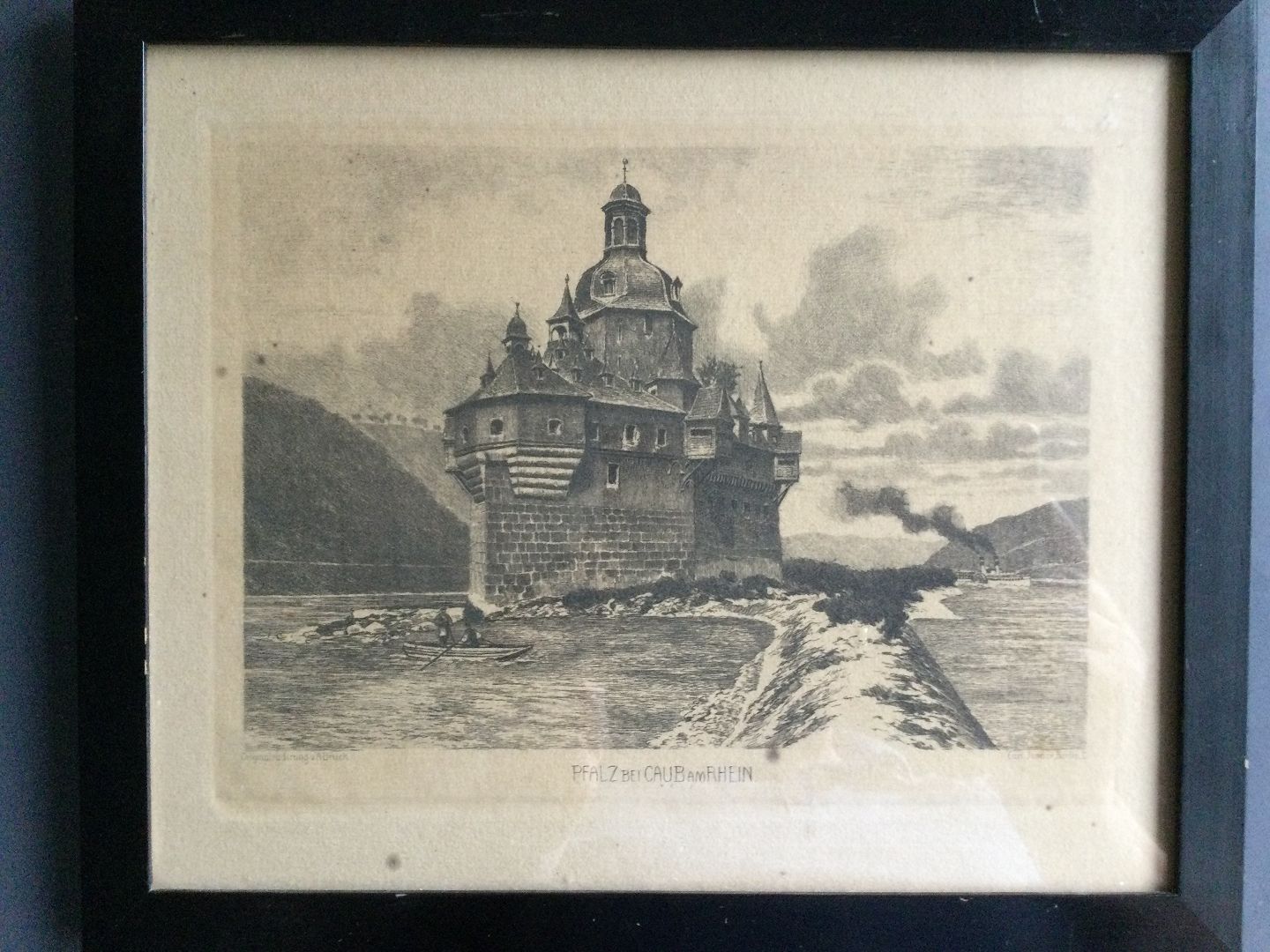 Text zugänglich auf Dänische: Radering af Albrecht Bruck - Pfalzgrafenstein Slot, Tyskland,