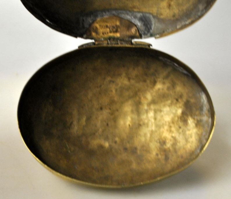 Holländische Tabaksdose aus Messing mit Dekorationen in Form von zwei Frauen und Landschaft mit Kirche. Oval mit Deckel. Reparationen. Mit dem Eigentümer Initialen und Jahr signiert. 1749 L:. 11 cm.