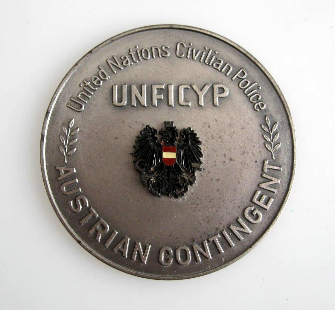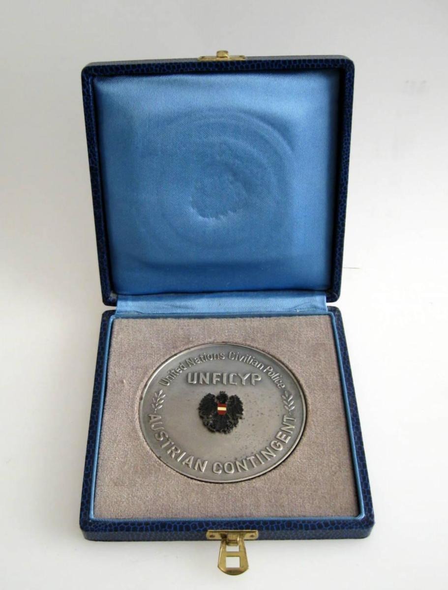 UN-Medaille - Vereinte Nationen Zivilpolizei - UNICYP. Österreichisches Kontingent. Dia:. 7,5 cm. Metall mit Emaille. Mit der Aufschrift:. Lt. Col. PEP Skov CO DANCON zur freundlichen Erinnerung, Zypern 1971. In origniales Etui. Provenienz: Oberstleutnant Poul Ervin O. Skov, Kommandant Dancon XIV, Zypern.