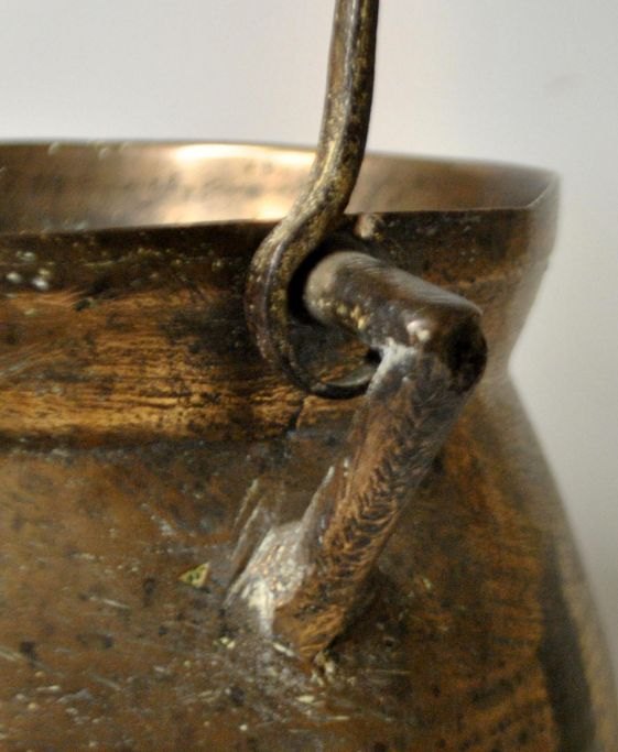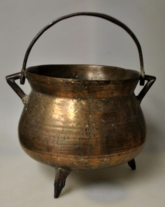 Dreibeiniger Topf aus Bronze, 17./18. Jahrhundert. Norddeutschland. Mit Henkel und drei Beinen. Ohne Marke. H.: 20 cm. Höhe mit Henkel: 30 cm. Durchmesser: 20,5 cm.