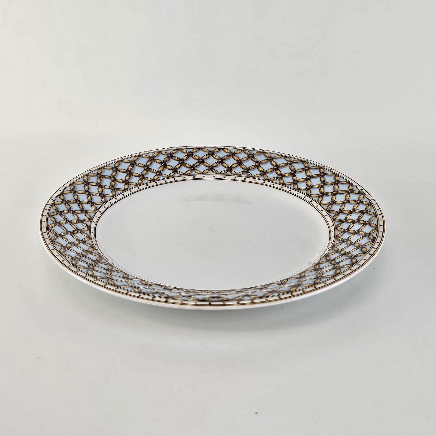 Liselund er hvidt porcelæn dekoreret i lyseblå eller mørkeblå nuancer med fletmønster