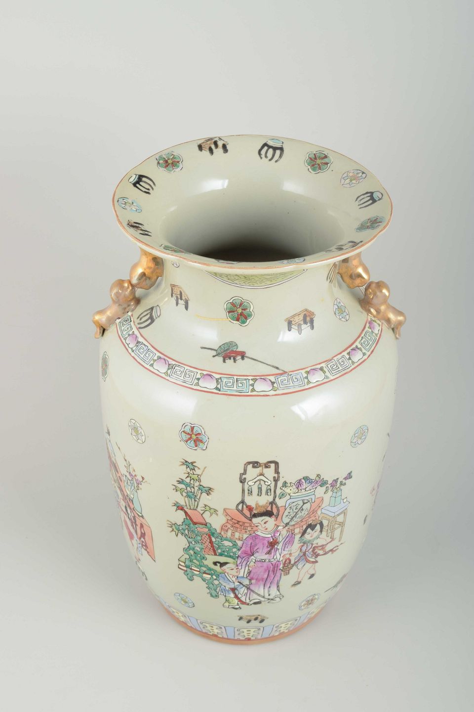 Kinesiske porcelænsvaser fra det 20. århundrede kombinerer traditionelle dekorationsformer med senere tiders produktionsteknikker. Scenedekorationer med figurer hentet fra klassisk kinesisk kulturhistorie er typiske, og guldfarvede løvehanke understreger forbindelsen til ældre kejserlige forlæg.
