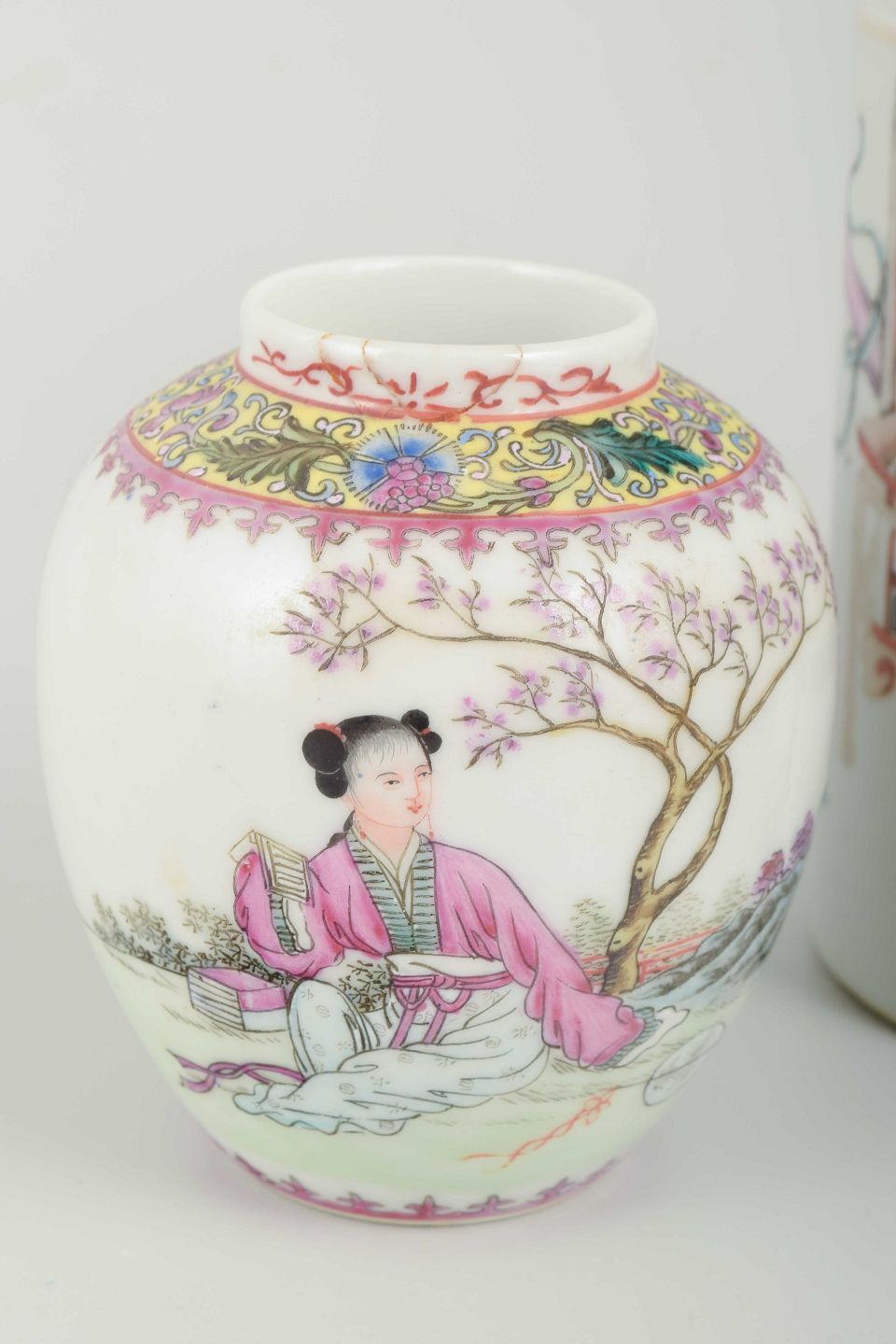 Kinesisk porcelæn fra 1900-tallet spænder over både traditionelle og mere folkelige dekorationer. Famille rose-paletten, introduceret i Qing-dynastiet i 1700-tallet, blev fortsat anvendt langt ind i 1900-tallet, ofte med motiver af figurer, blomster og symboler for lykke og lang levetid. De røde tryk med kalligrafiske tegn er klassiske symboler for held og dobbeltlykke, ofte anvendt ved ceremonielle sammenhænge.