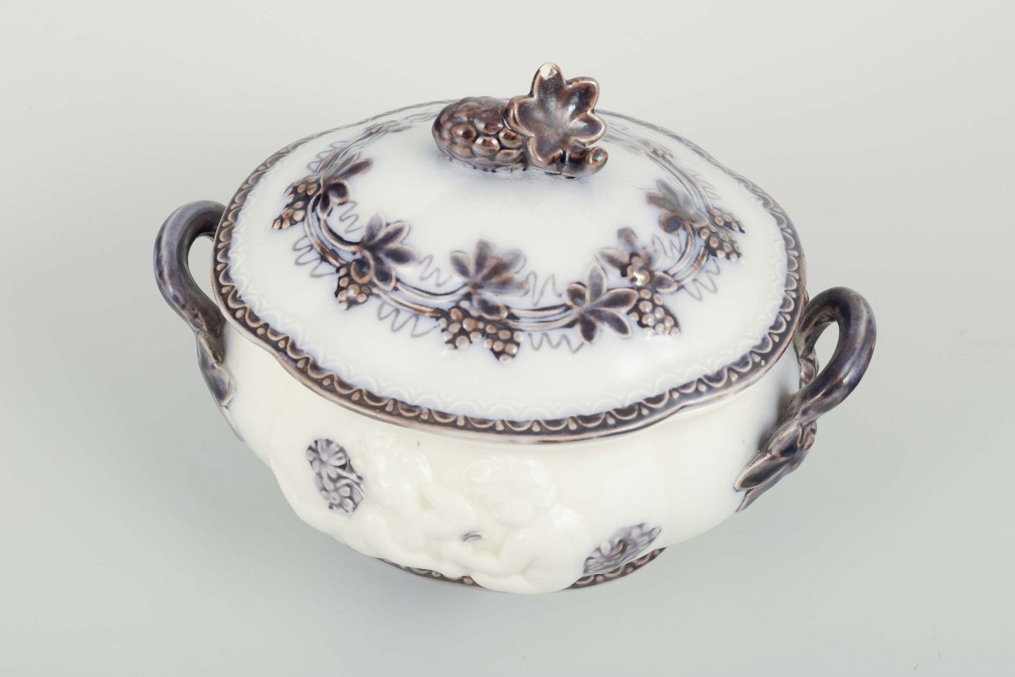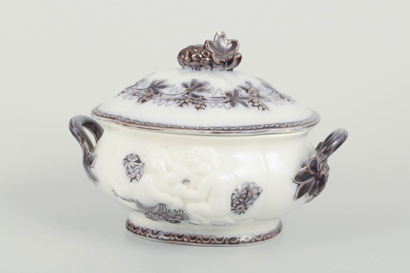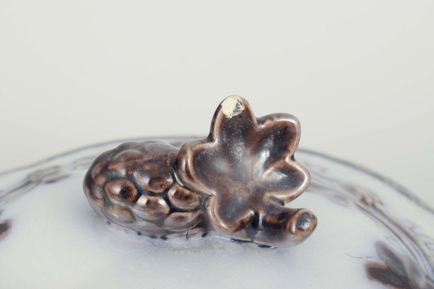 Oval fajanceterrin med låg, formet med dobbelt hank og knop udformet som drueklase og blad. Dekoreret med relief- og transfertryk i brunlig tone med vinrankemotiv.