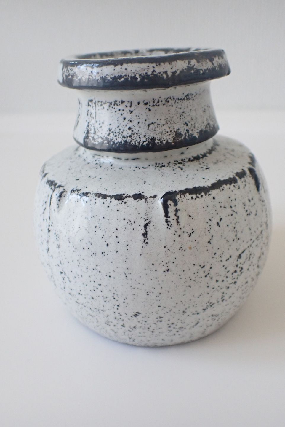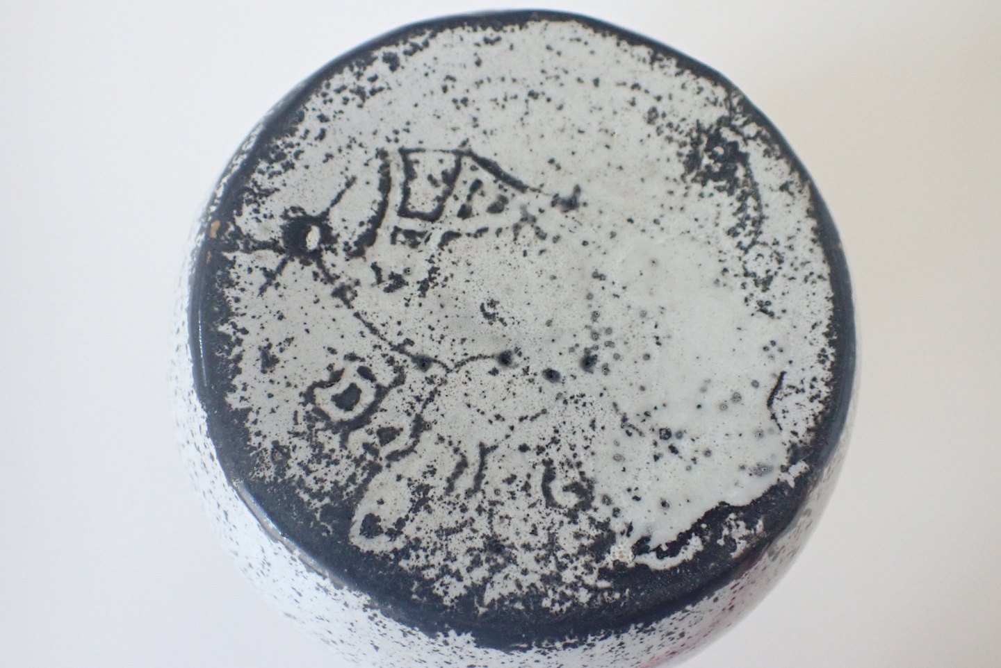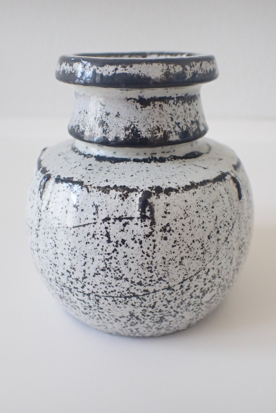 Text zugänglich auf Dänische: Svend Hammershøj (1873 - 1948) for Kähler. Buttet keramikvase i sort/hvid dobbeltglasur(askeglasur).Med smallere kantet hals og små dekorative "ører". Stemplet HAK, Denmark. Højde: 19,5 cm. I fin stand.
