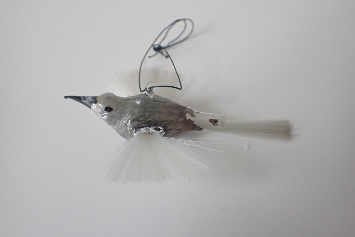 Øverst: Fugl i sølvfarvet glas med rød og sort bemaling og grøn hale. Tysk, 1950-erne. 12 cm. med hale. I fin stand i forhold til alder. Pris. 200 kr.