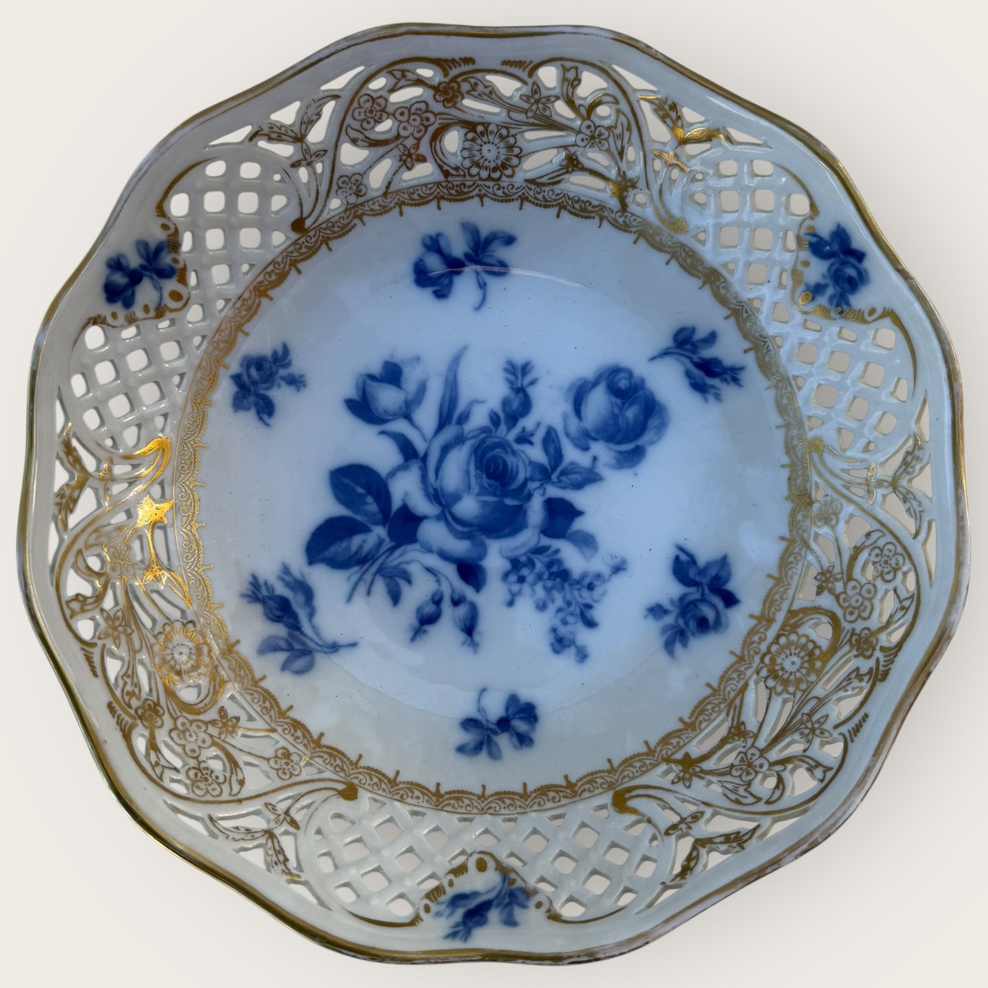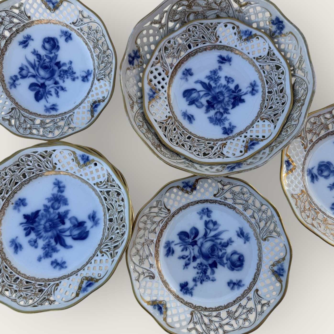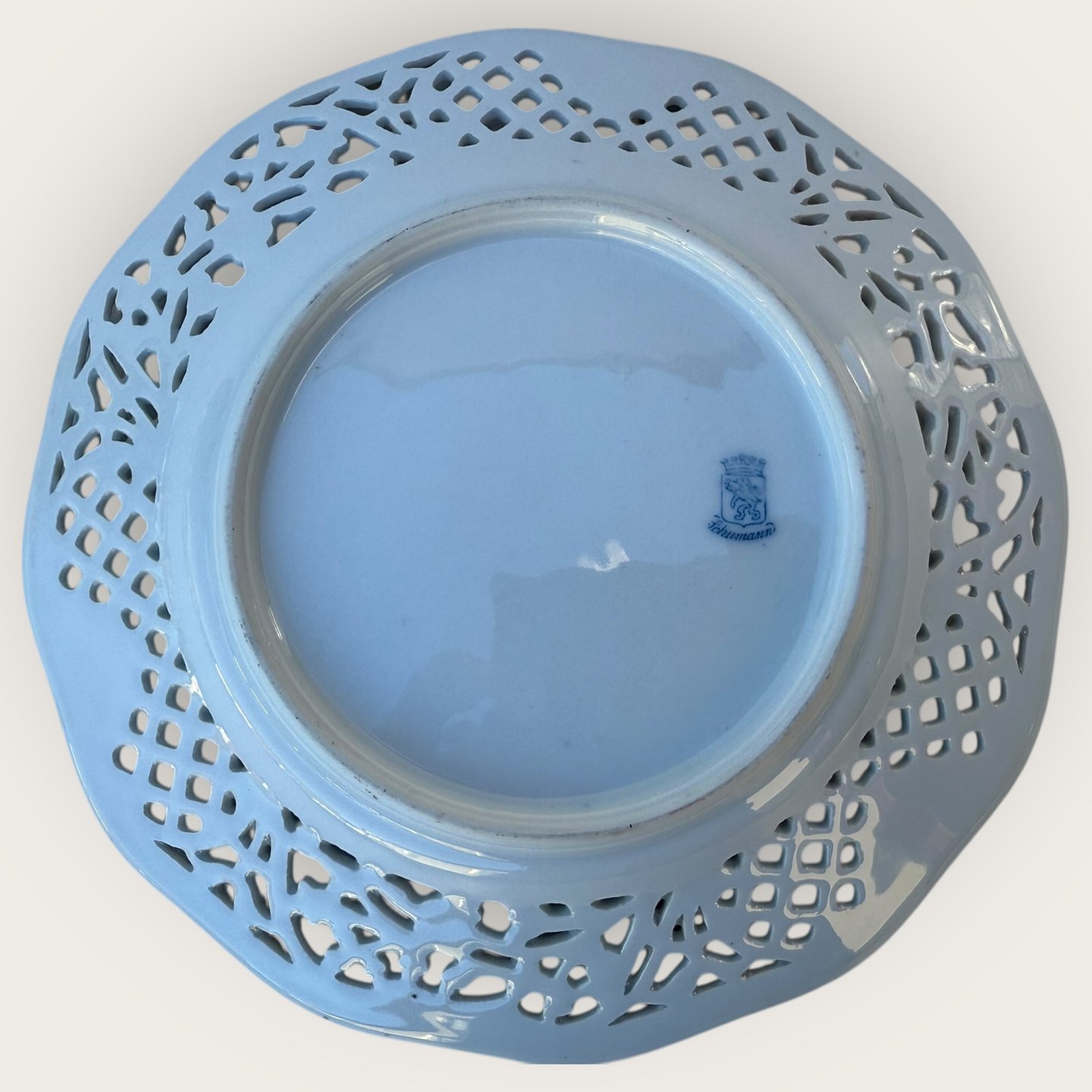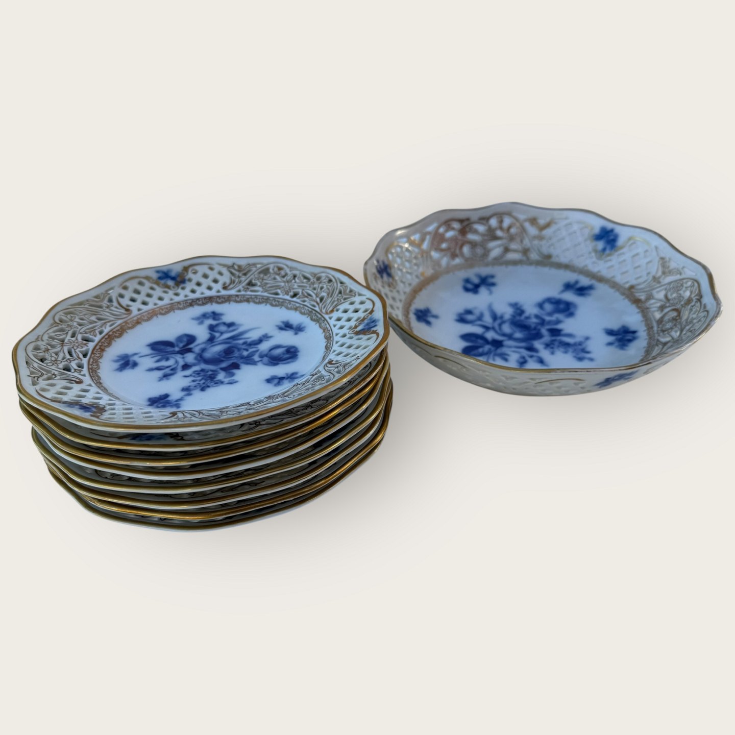 Schumann, Deutschland, Schüssel und 8 Teller mit durchbrochenem Rand, etwas Abnutzung am Goldrand der Schüssel, sonst guter Zustand, Tellerdurchmesser 19 cm, Schüsseldurchmesser 23 cm.