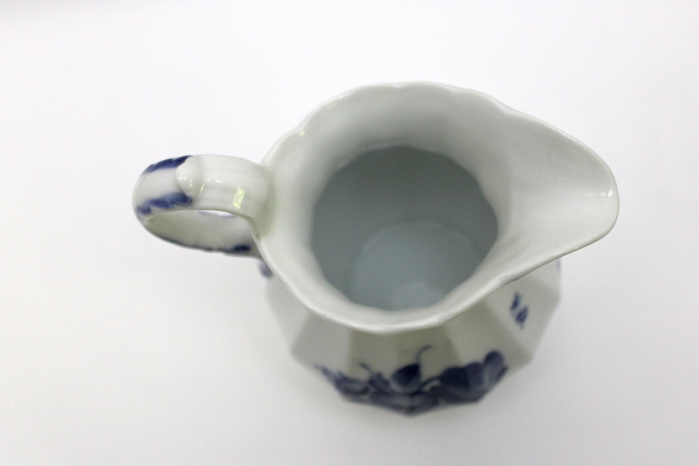 Text zugänglich auf Dänische: Royal Copenhagen, Blå Blomst Kantet, Stor mælke eller vandkande. Nr. 10/8522. Højde 22,5 cm. Længde 18,5 cm. Diameter 14 cm. I. sortering Fin stand. Pris: 850 kr. Lager: 1