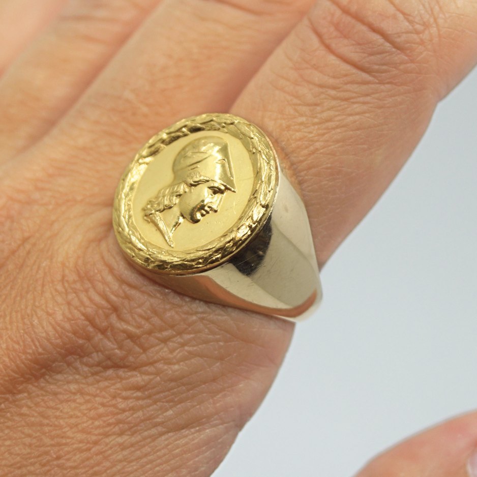 Text zugänglich auf Dänische: Frantz Hingelberg; Doktorring i 14 kt. guld. Plade i 23 kt. guld med motiv af Minervahoved omgivet af en laurbærkrans. Motivet at Athena/Minerva, den græsk-romerske gudinde for videnskab, har været brugt til doktorringe i Danmark siden 1866.