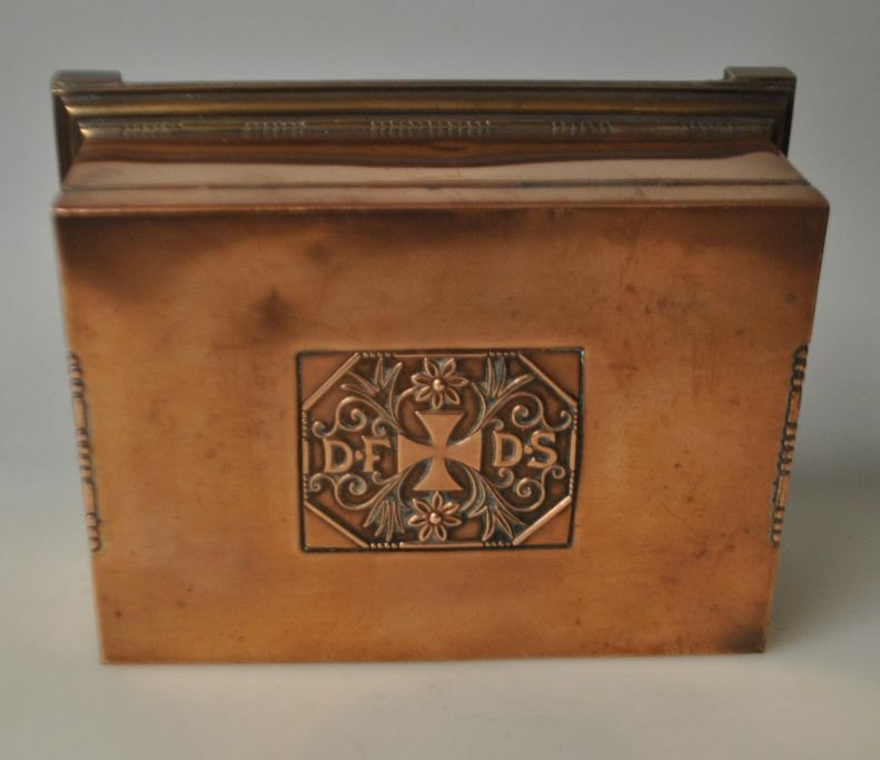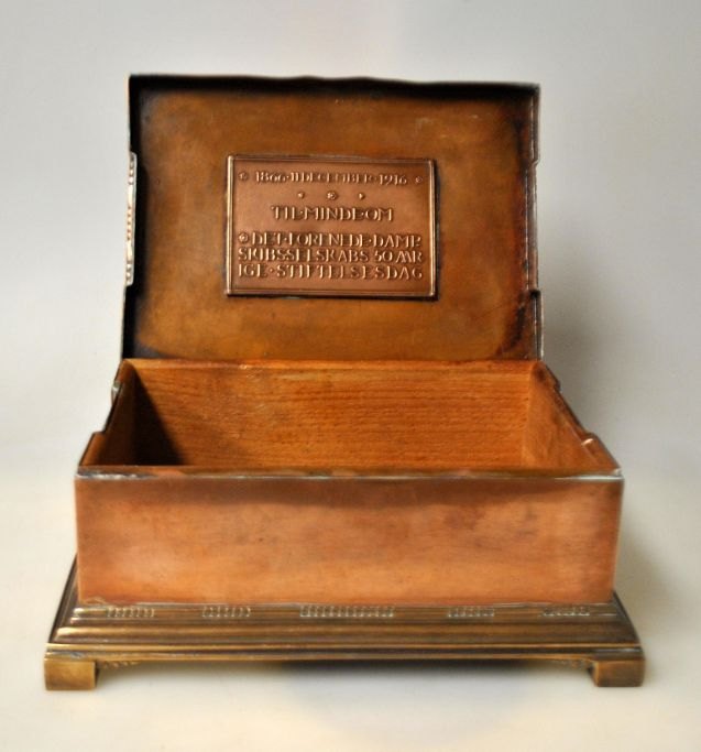 DFDS-Zigarrenkiste aus Kupfer und Messing, innen mit Holz. 1916. Johan Rohde für Georg Jensen. Geprägt mit künstlerischen Motiven und DFDS 1866-1916. Innenplakette: Zur Erinnerung an das 50-jährige Jubiläum der United Steamship Company. H. 8,5 B. 19 T. 14 cm.