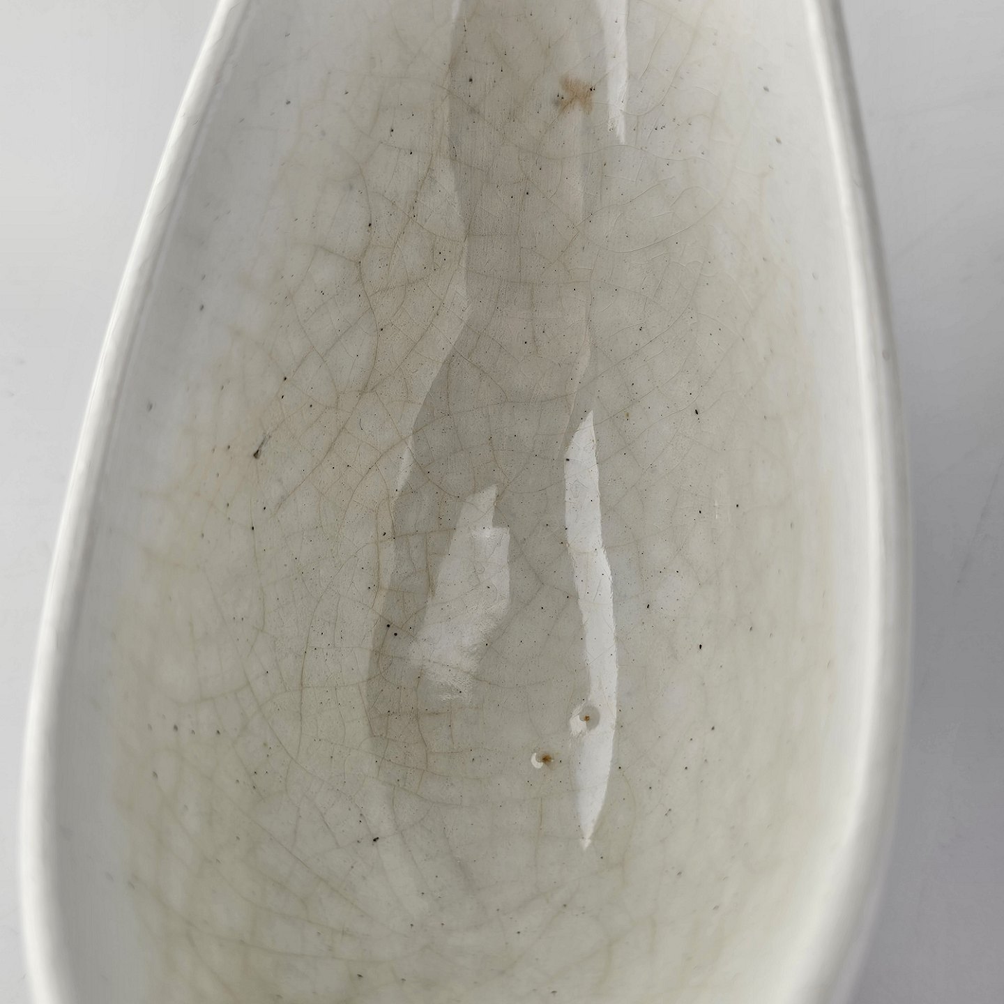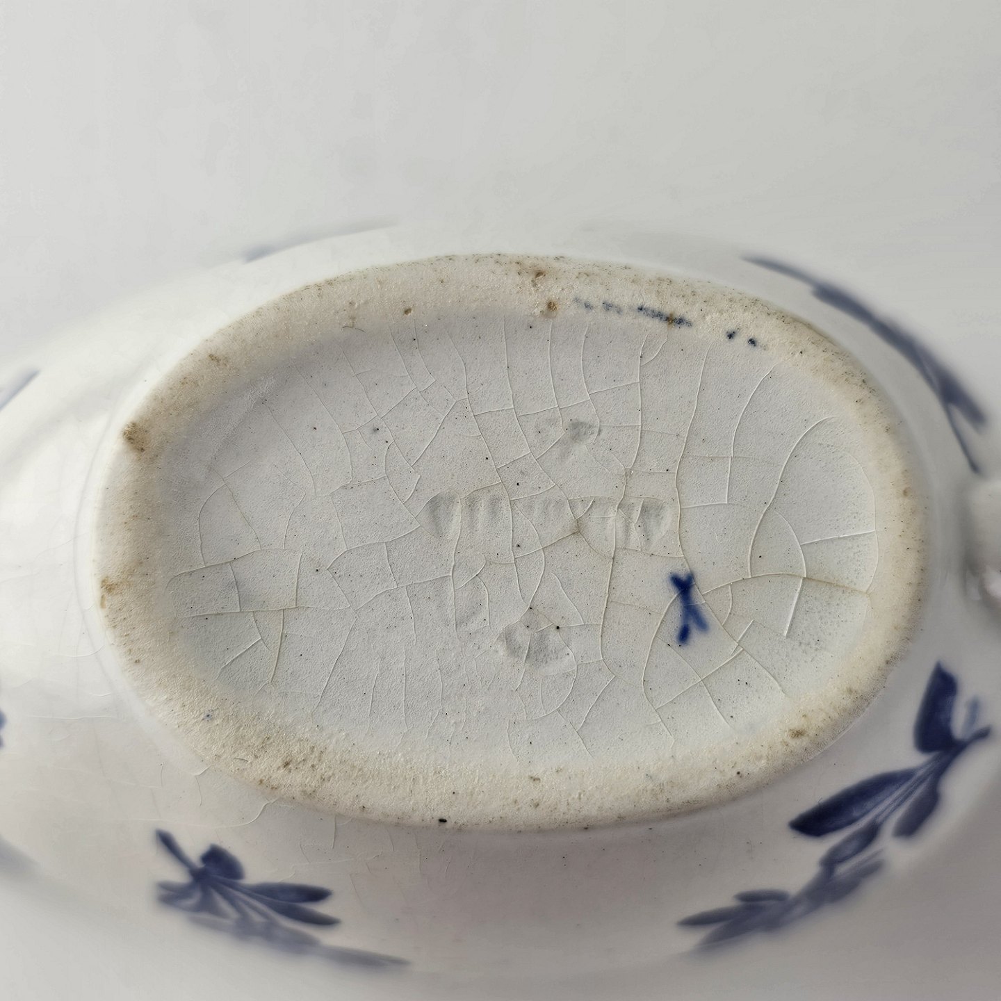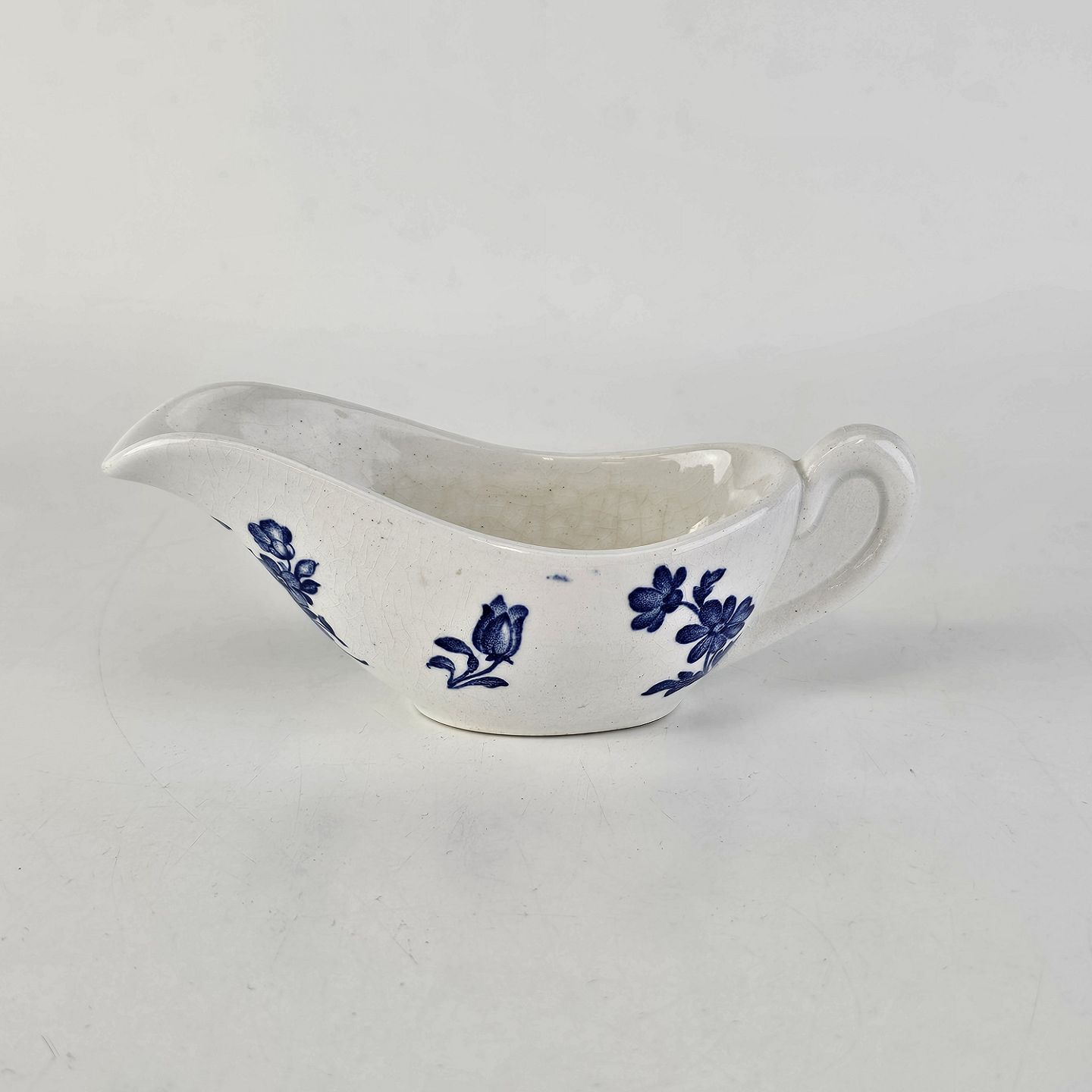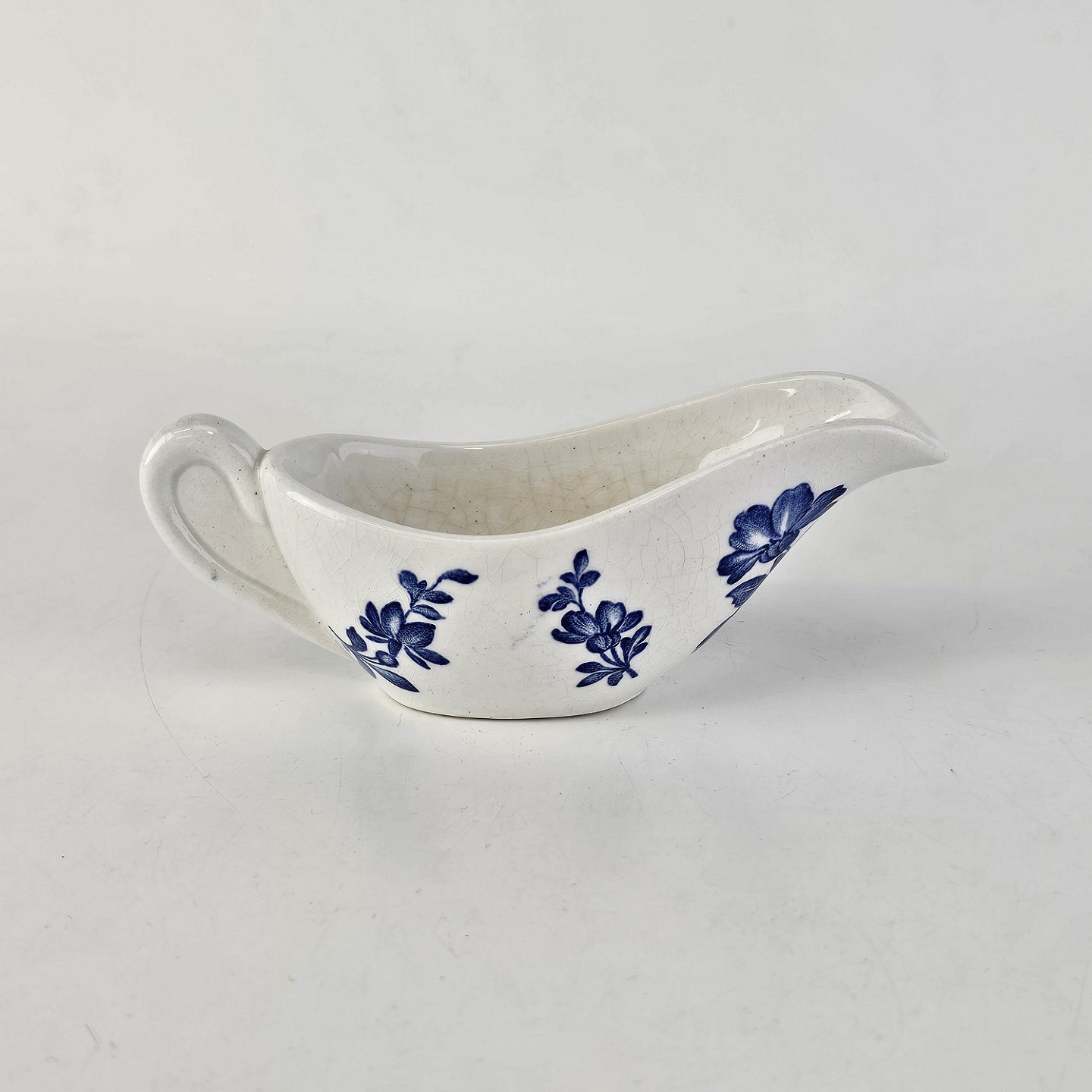 Stel i glat hvid fajance med dekoration af blå blomster og flettet kant