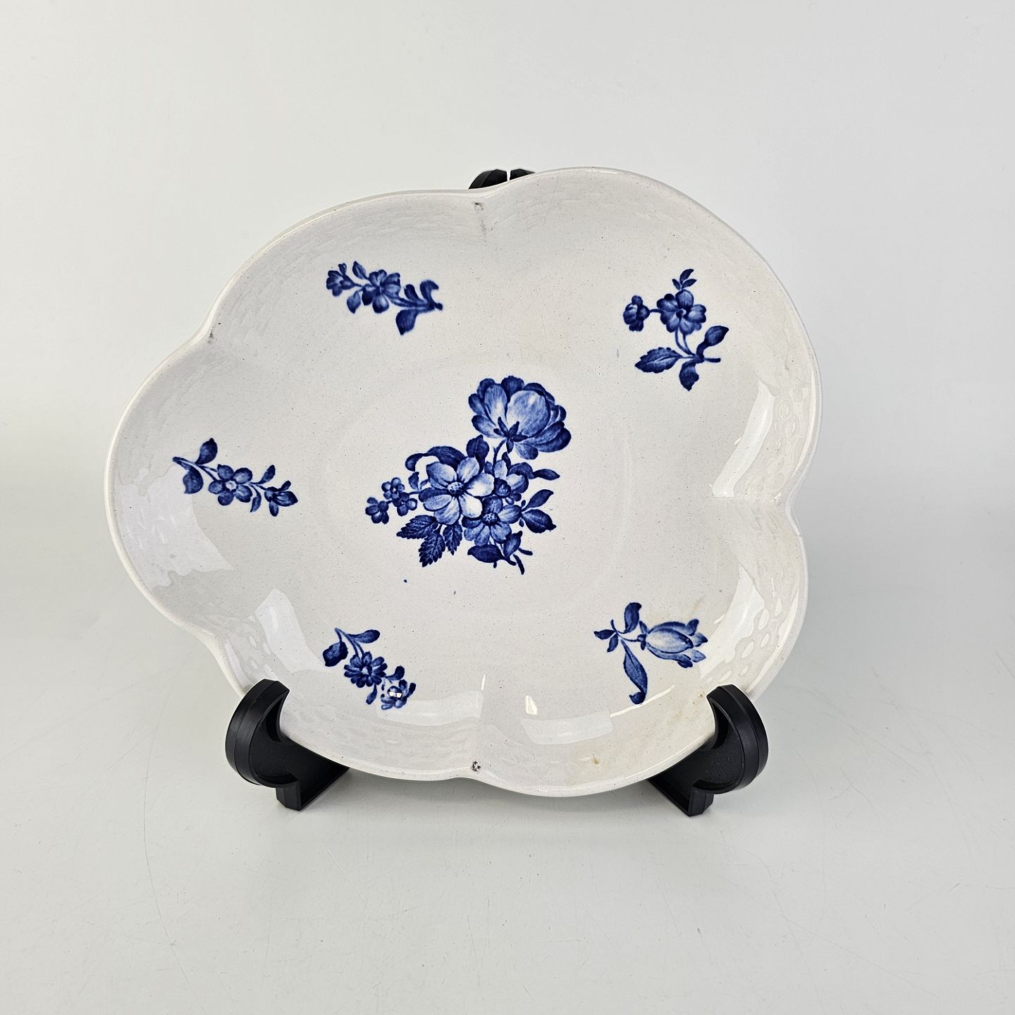Stel i glat hvid fajance med dekoration af blå blomster og flettet kant