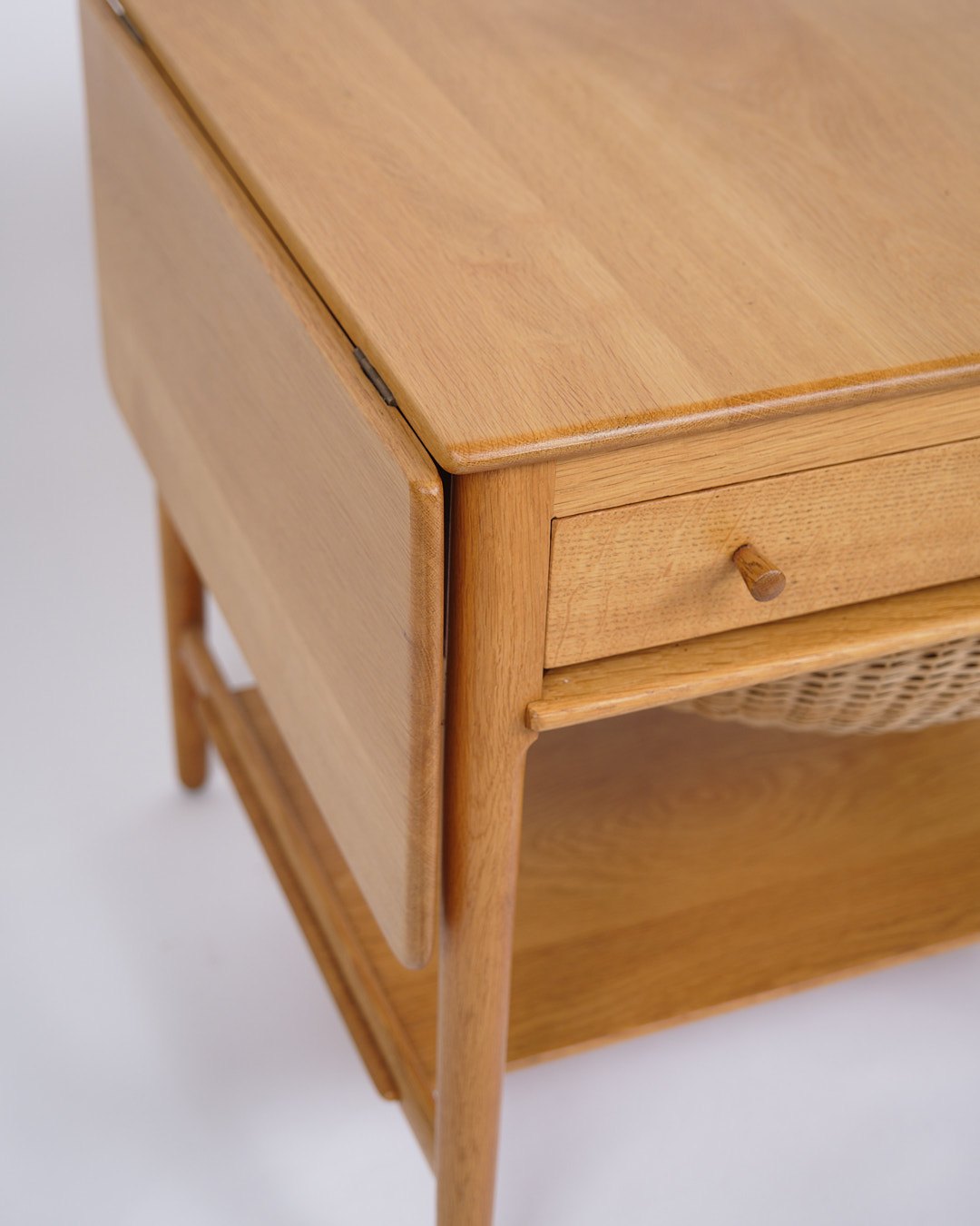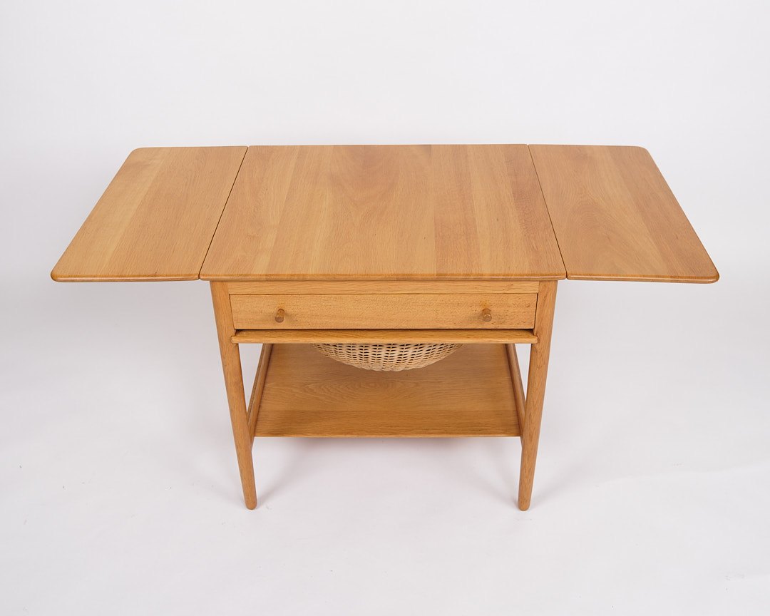 Sybord, model AT-33, designet af Hans J. Wegner og produceret af Andreas Tuck i 1950’erne. Bordet er udført i sæbebehandlet egetræ og indrettet med en praktisk hylde. Bordpladen kan udvides fra 64,5 cm til 118,5 cm, hvilket gør det både fleksibelt og funktionelt.