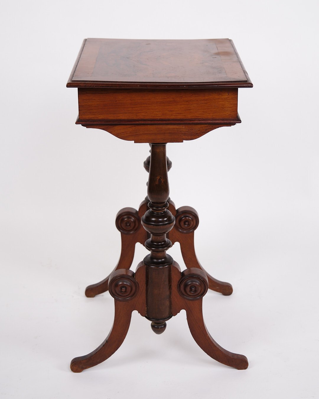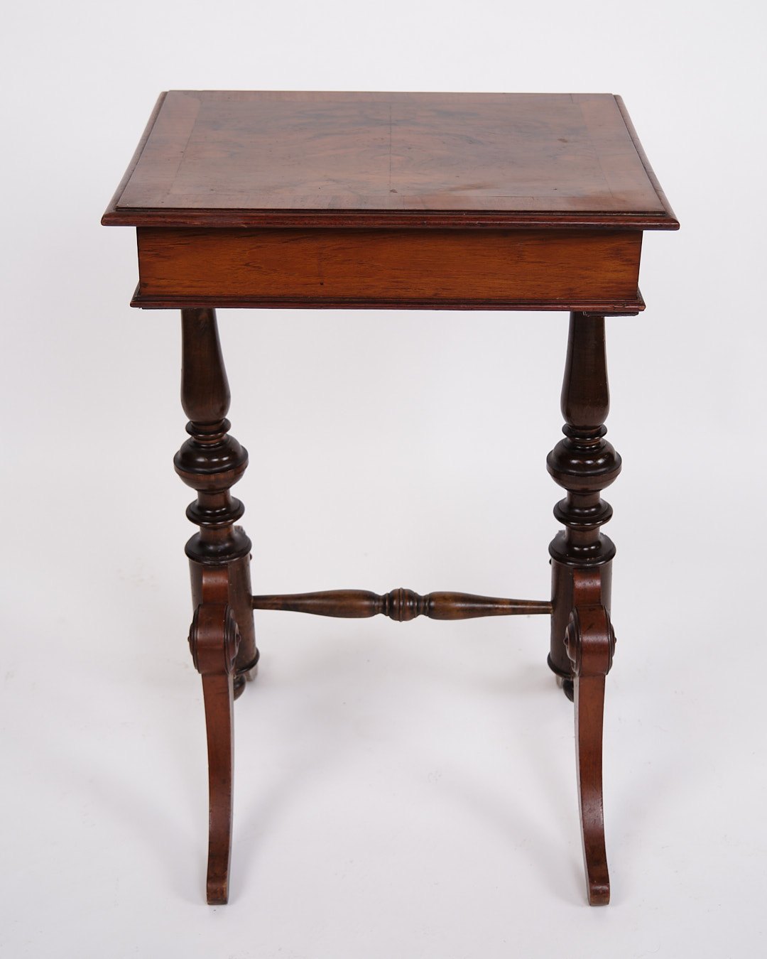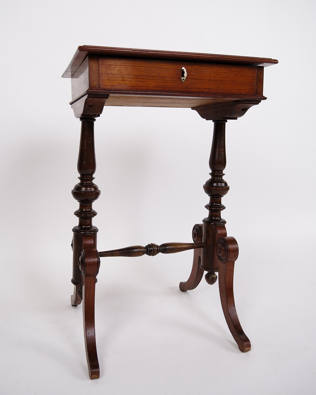 Text zugänglich auf Dänische: Antikt sidebord i håndpoleret mahogni fra 1880’erne. Med skuffe og drejede ben.