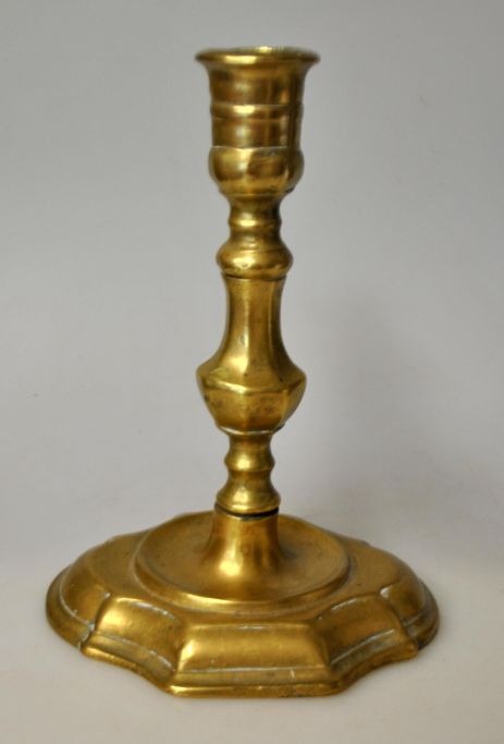 Dänischer Barockleuchter aus Messing, 18. Jahrhundert. Profilierter Schaft und abgebrochener, achtseitiger, länglicher Fuß. H.: 16,5 cm.