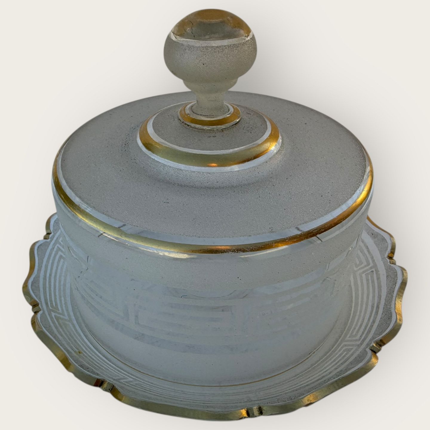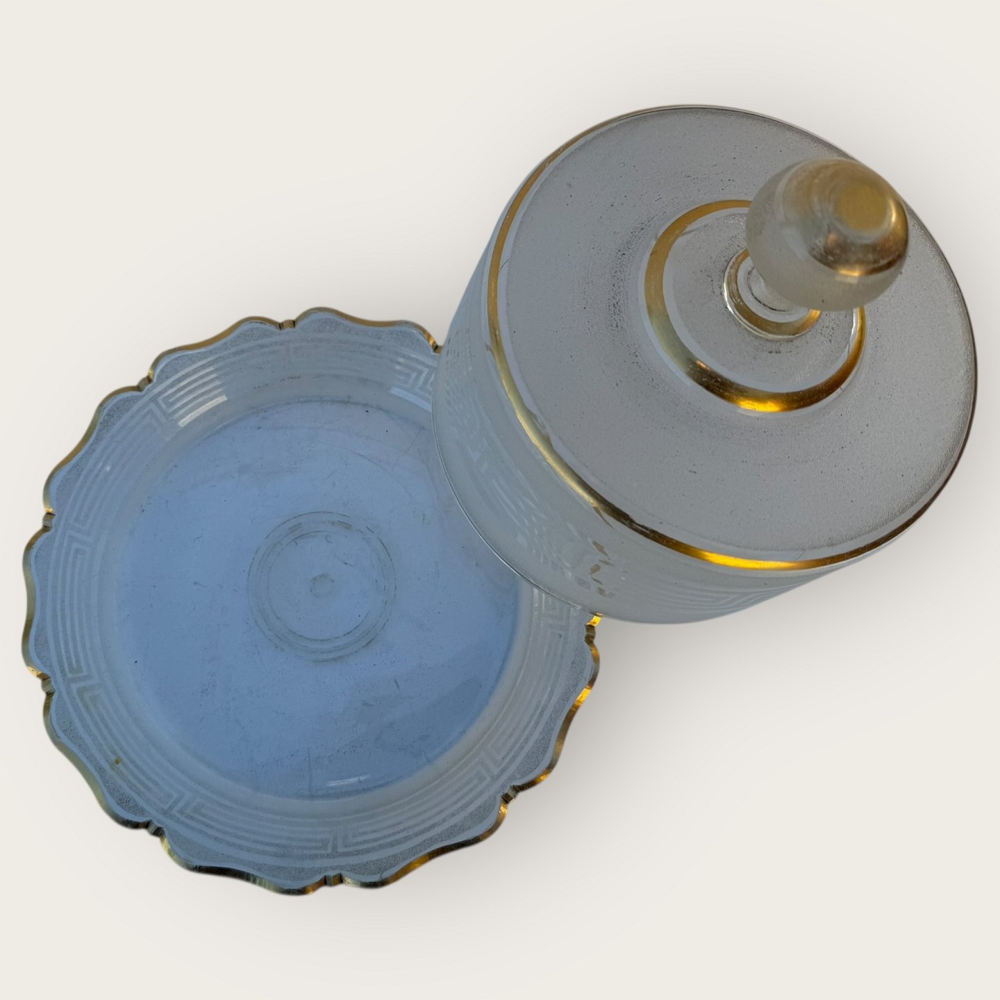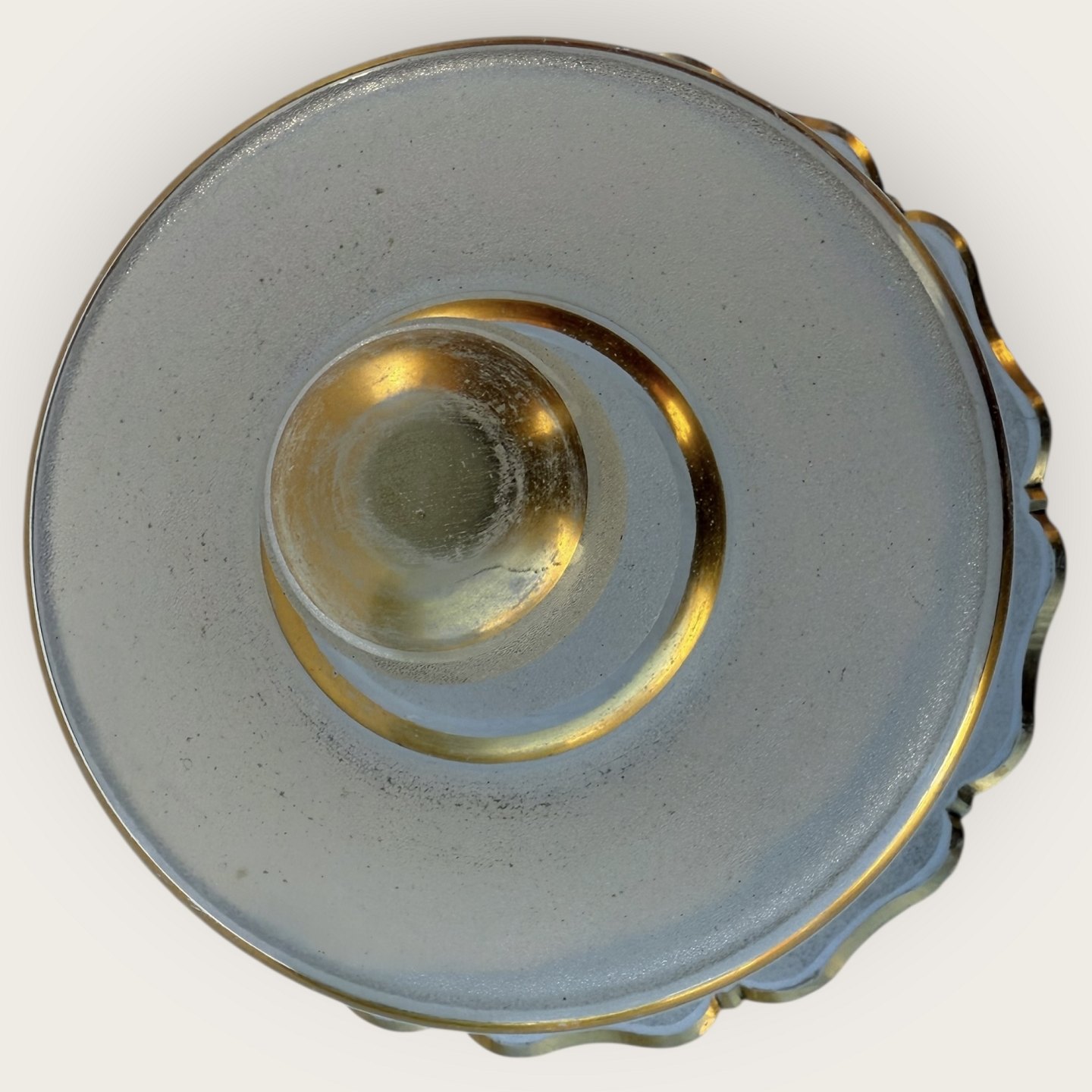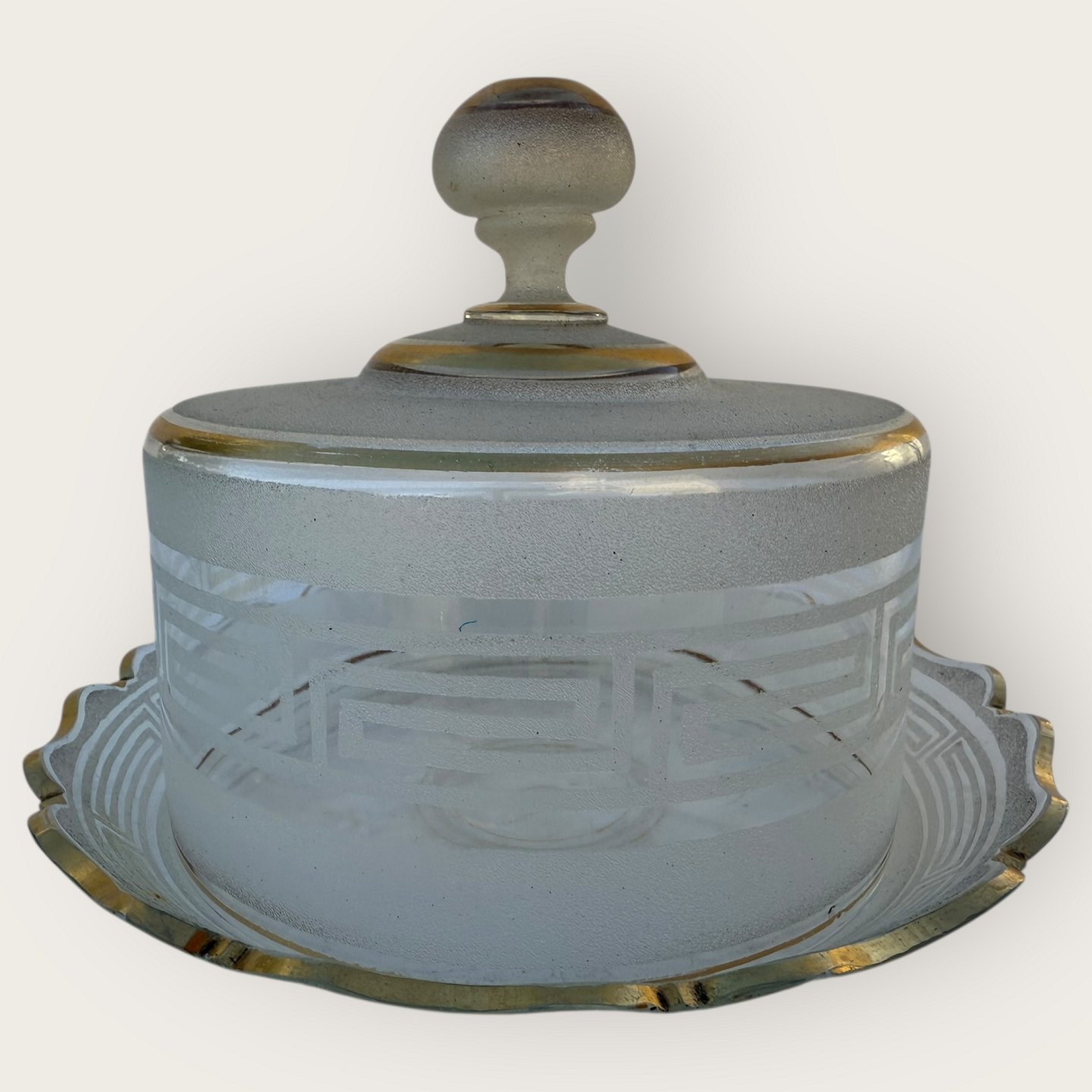 Speiseglocke aus Milchglas mit Goldfarbe, etwas Patina auf dem Gold, sonst guter Zustand, Durchmesser 23 cm, Höhe 15 cm