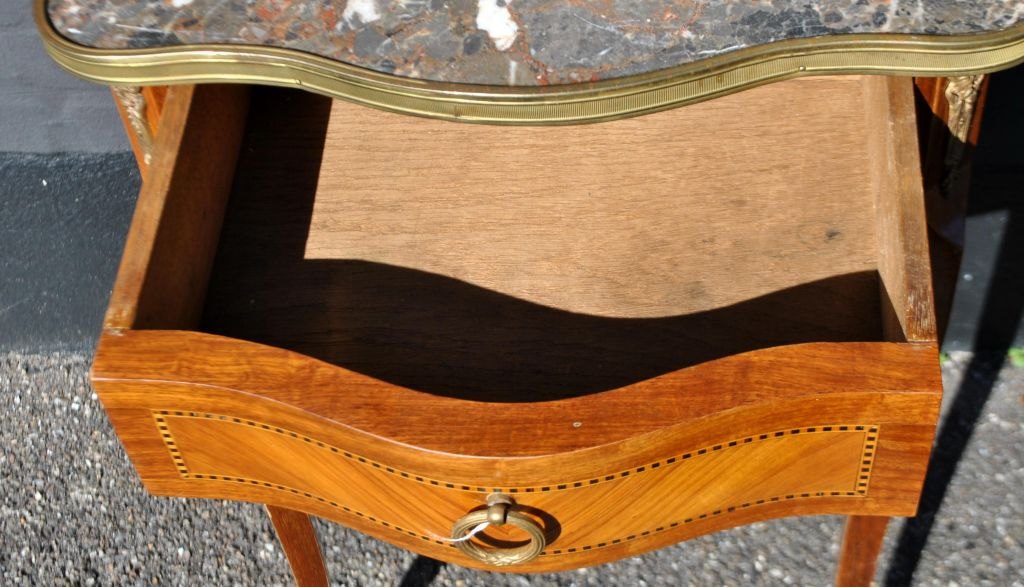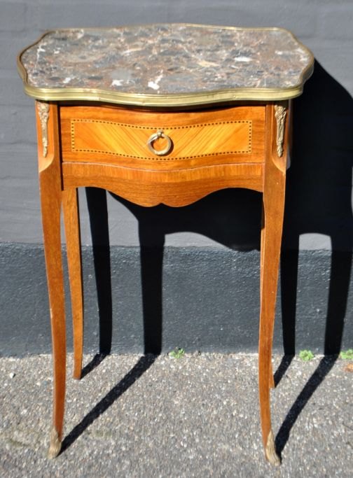 Französischer Lampentisch, 20. Jahrhundert. Mit Intarsien. Mit Messingkante und bunter Marmorplatte. Mit Bronzeschuh. H: 69 cm. B: 47 cm. T: 36 cm.