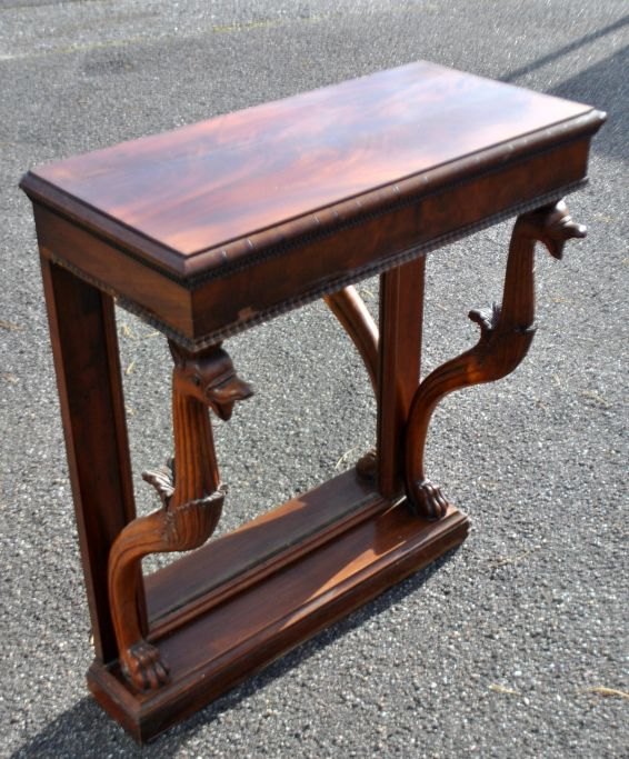 Konsole aus Mahagoni, spät Empire, ca. 1840. Dänemark. Mit Säulen in Form von Greifen mit Löwenfüßen. Rückseite mit Spiegel. H.: 87 cm. B.: 71 cm. T.: 36 cm.