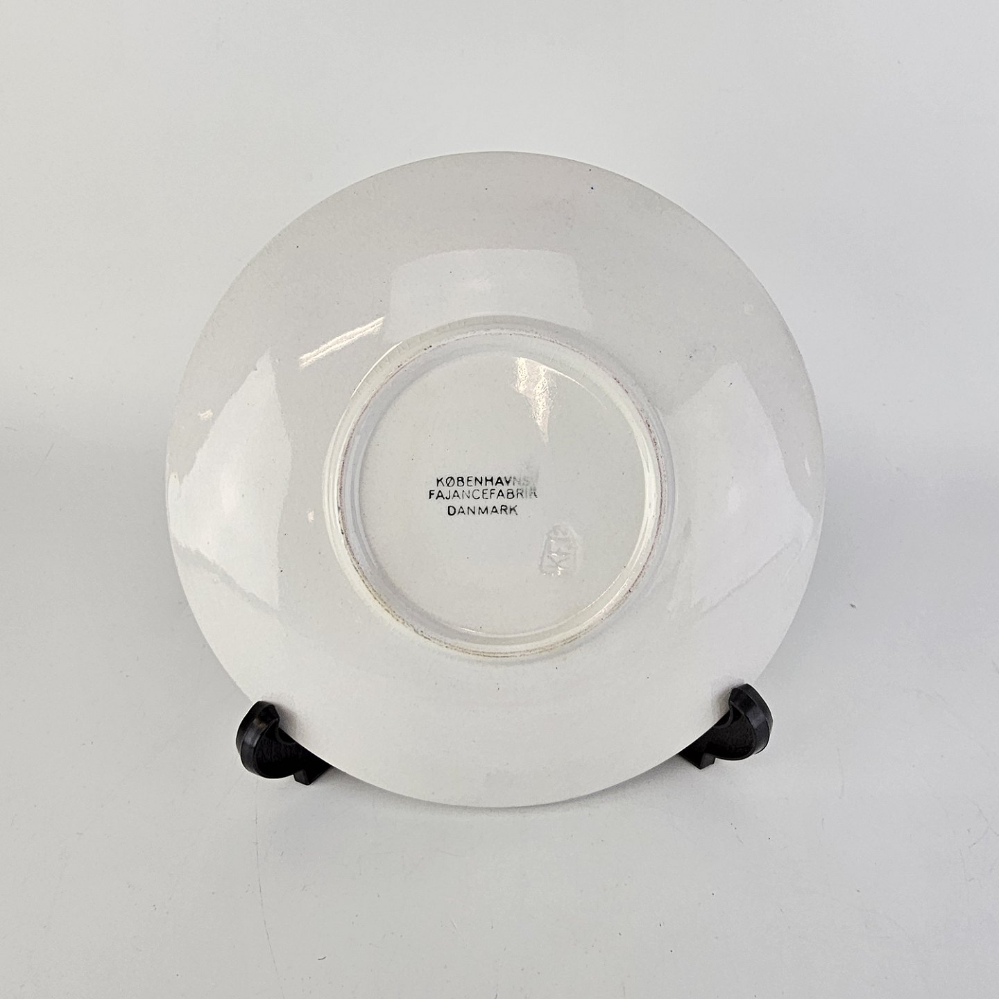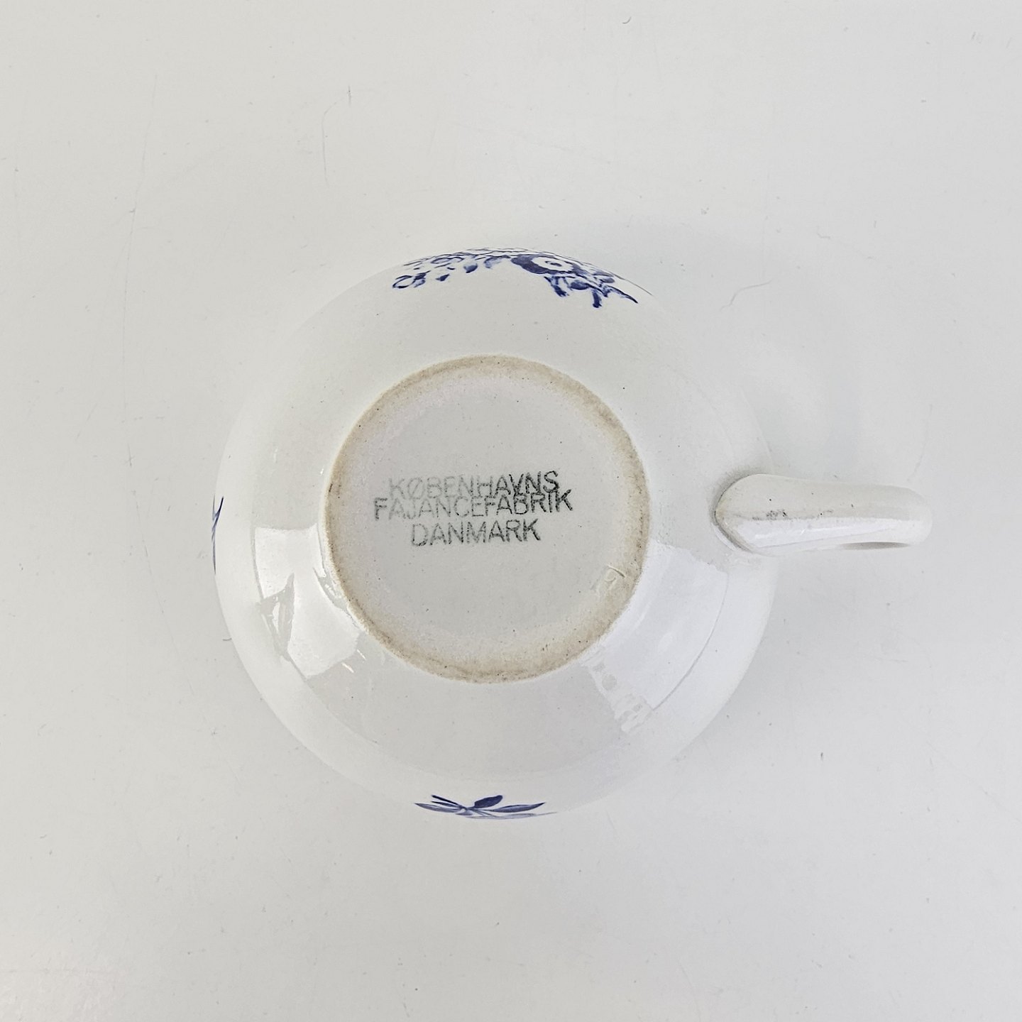 Stel i glat hvid fajance med dekoration af blå blomster og flettet kant