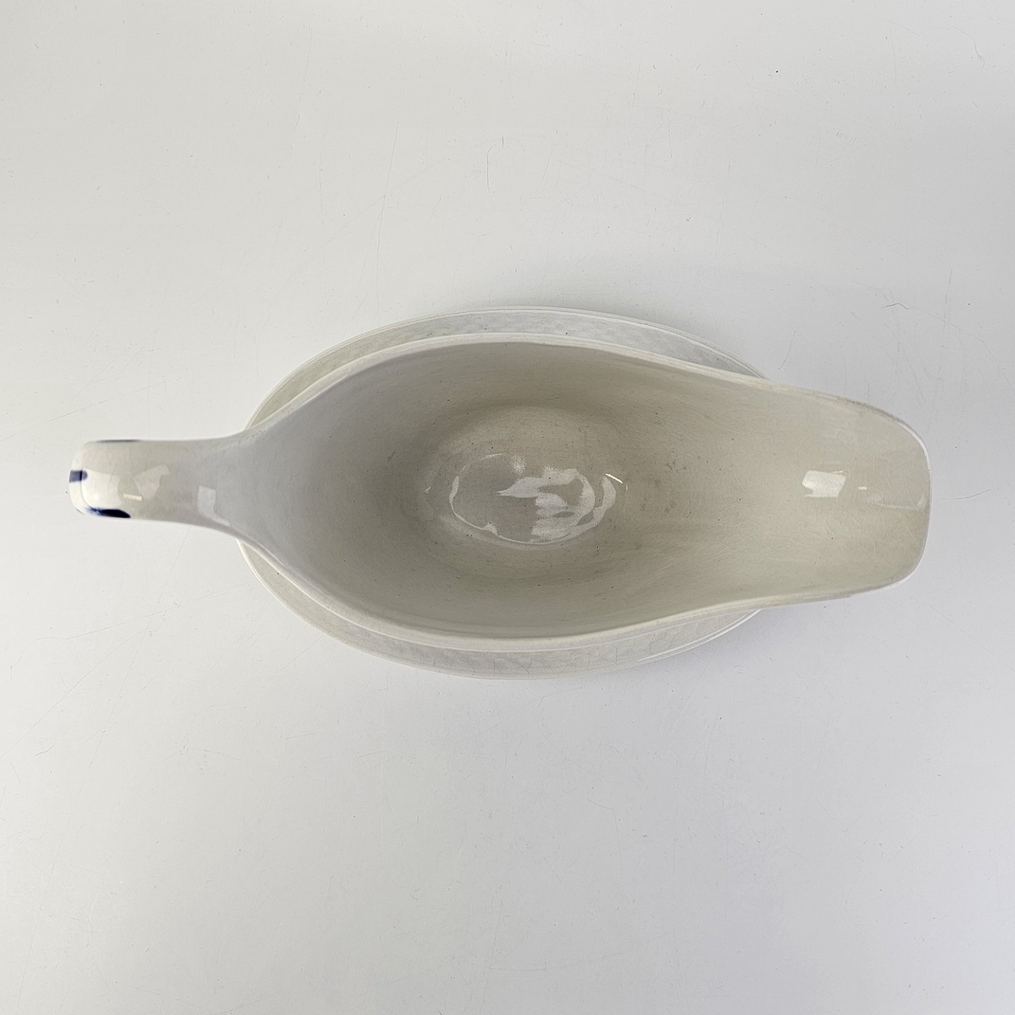 Stel i glat hvid fajance med dekoration af blå blomster og flettet kant