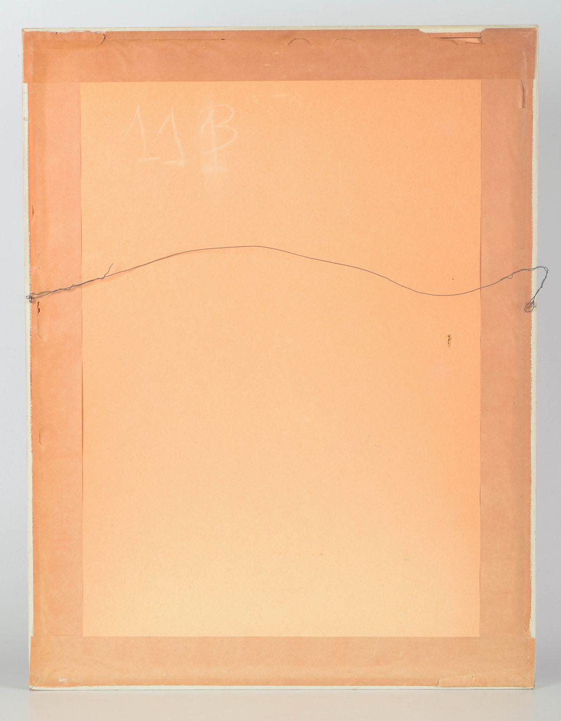 Et følsomt og drømmende portræt i dæmpede farvetoner, hvor de bløde linjer og det let slørede ansigt giver billedet en meditativ og næsten tidløs karakter. Den røde hovedbeklædning står som en varm kontrast til de kølige violette og grønne nuancer i baggrunden. Jordells arbejde med kridt fremhæver det sarte og stoflige udtryk, der giver motivet en særlig poesi.