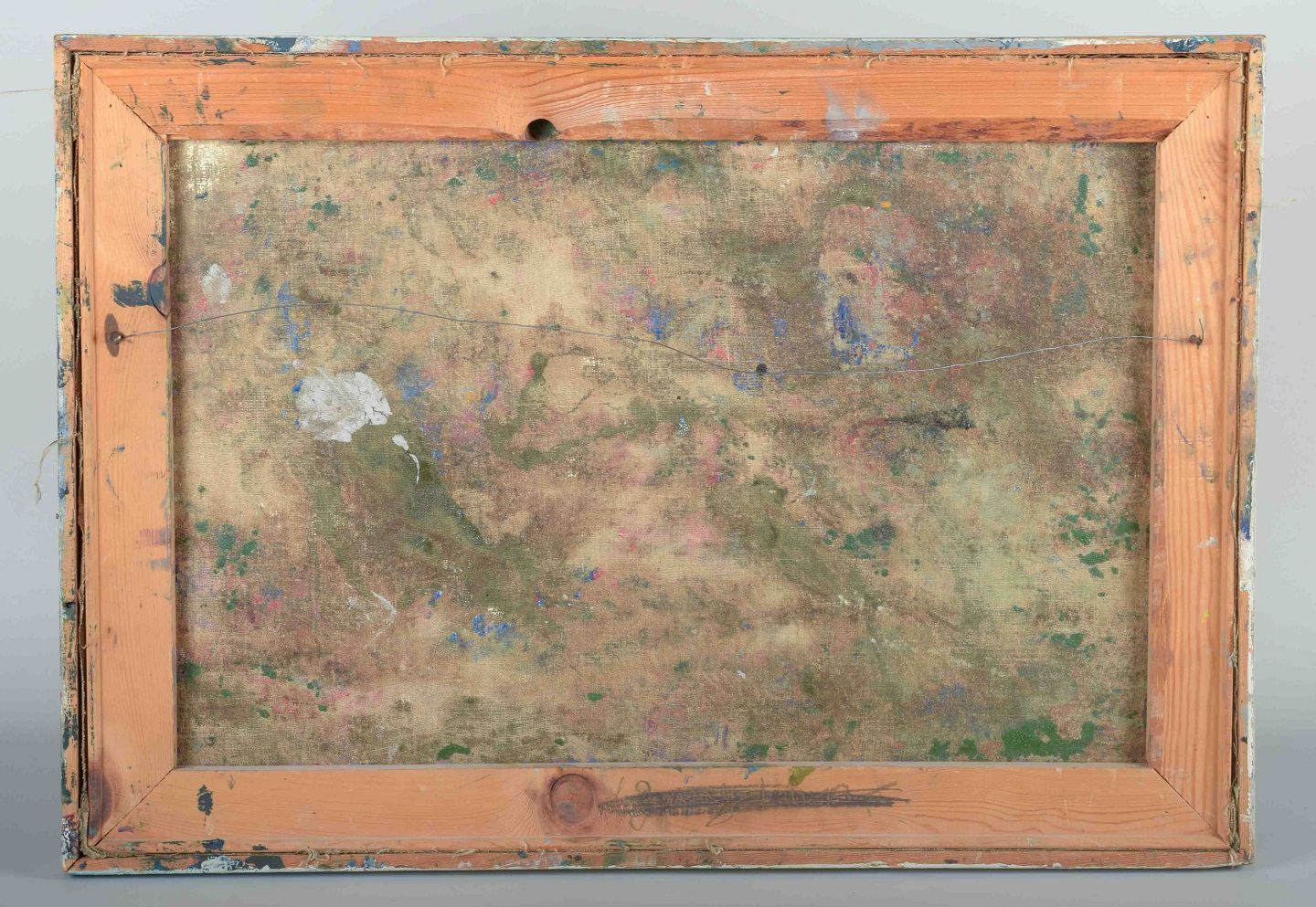 Et ekspressivt, koloristisk maleri udført med kraftige, pastose strøg i blå, røde, gule og hvide nuancer. Værket fremstår som en struktureret, men fri abstrakt flade, hvor farverne danner en dynamisk og levende komposition.