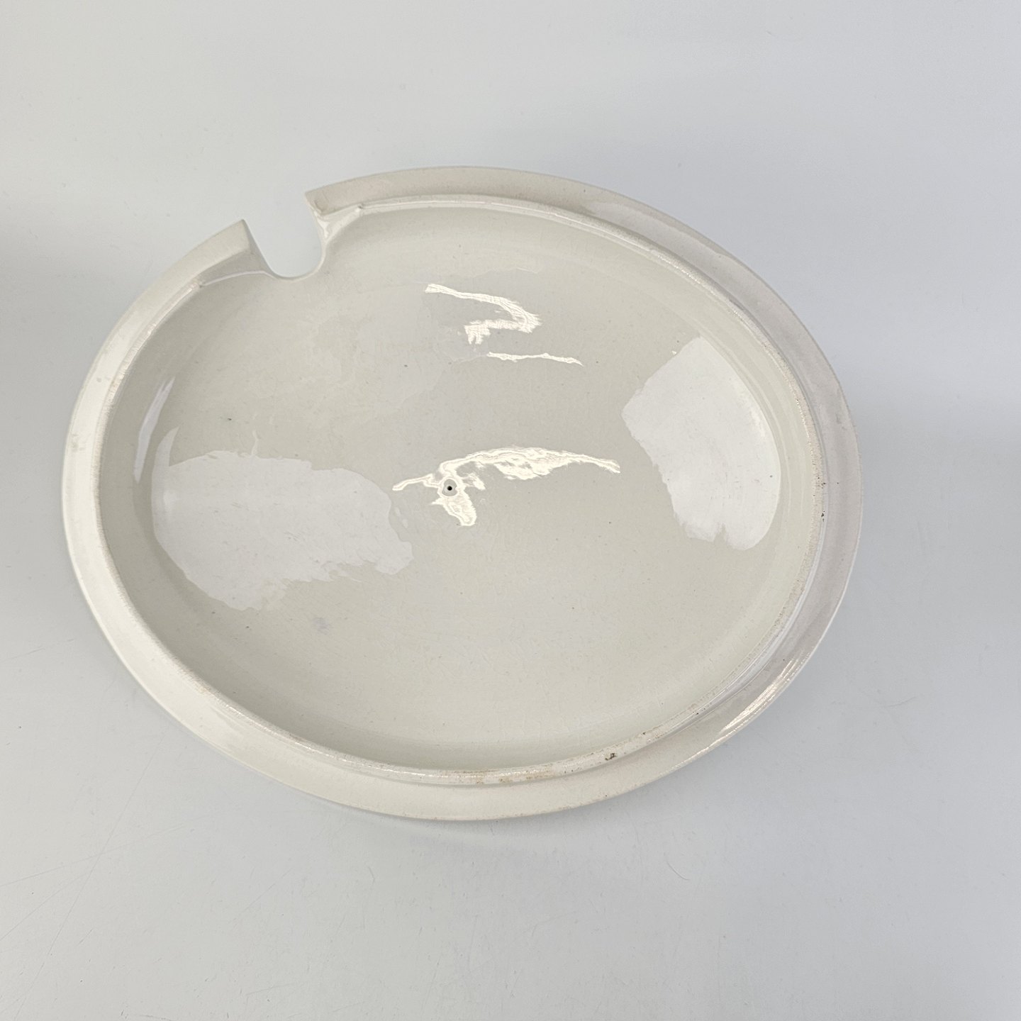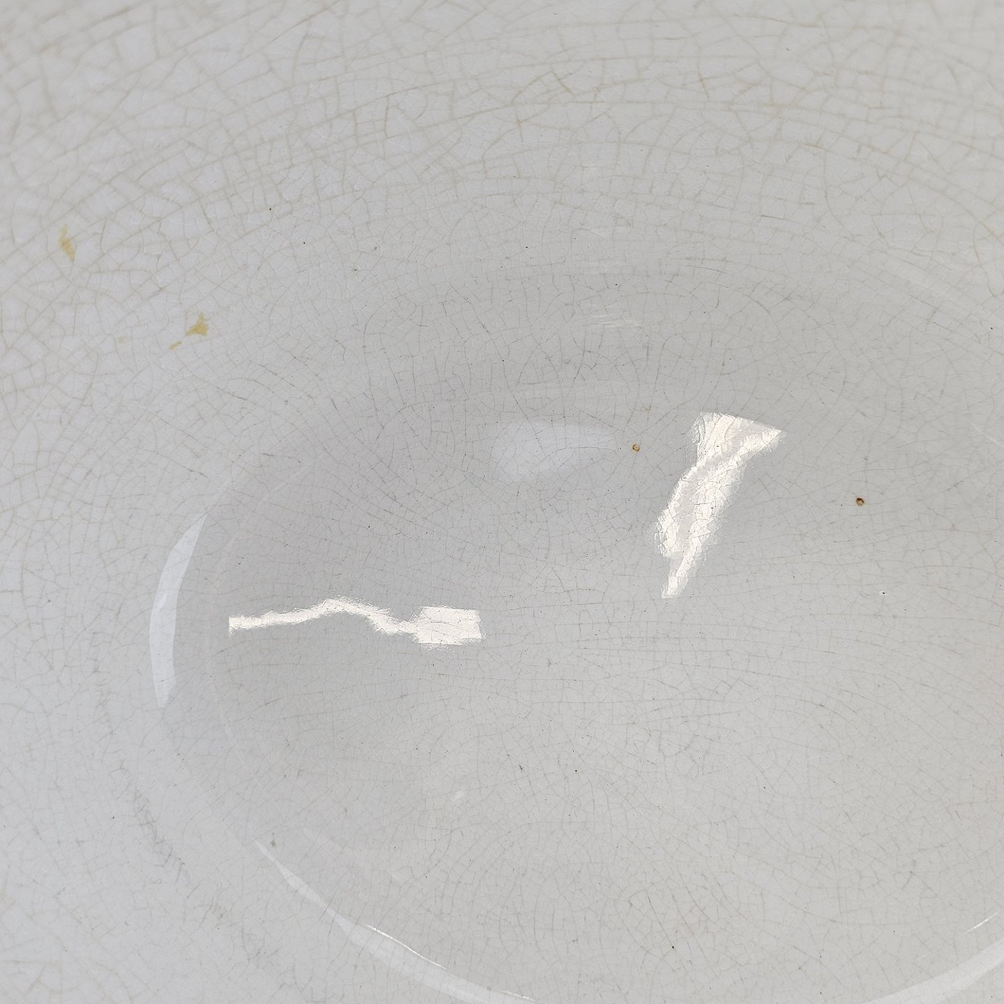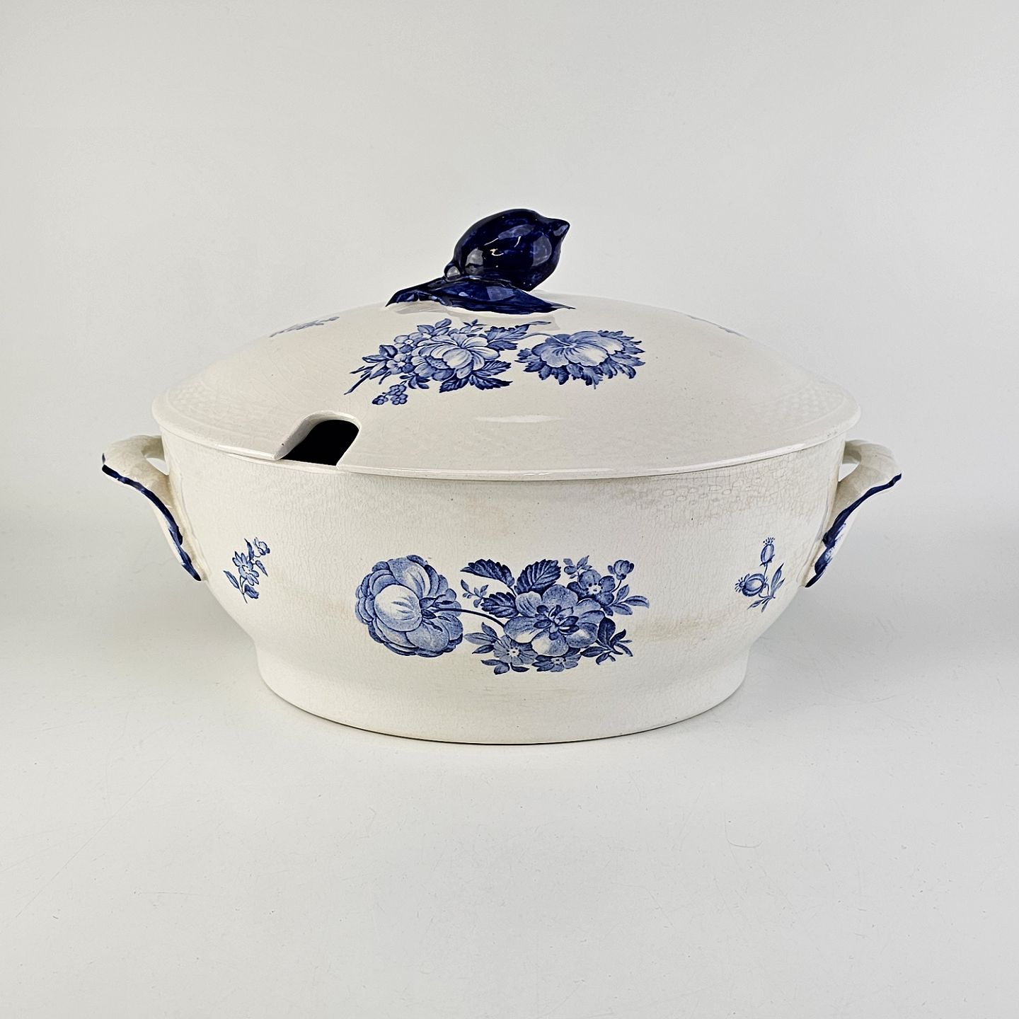 Stel i glat hvid fajance med dekoration af blå blomster og flettet kant