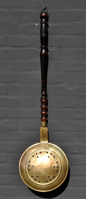 Heizbecken aus Kupfer und Messing, 19. Jahrhundert. Messingdeckel mit Sterndekor. Der Messingdeckel ist neuer als der Sockel. Holzgriff. Gestempelt. L: 100 cm. Durchmesser: 29 cm.
