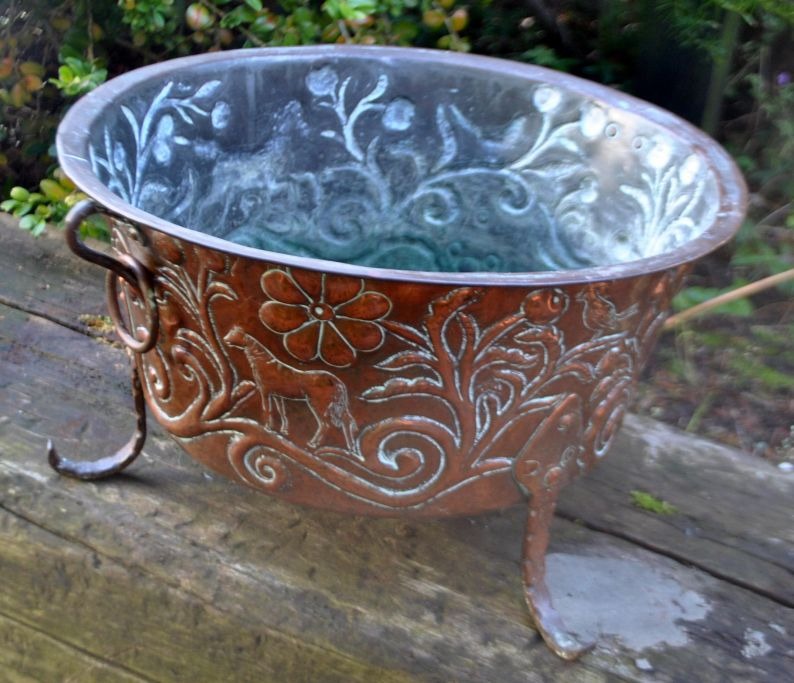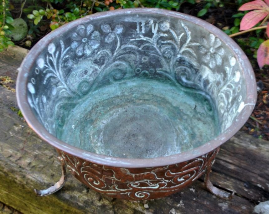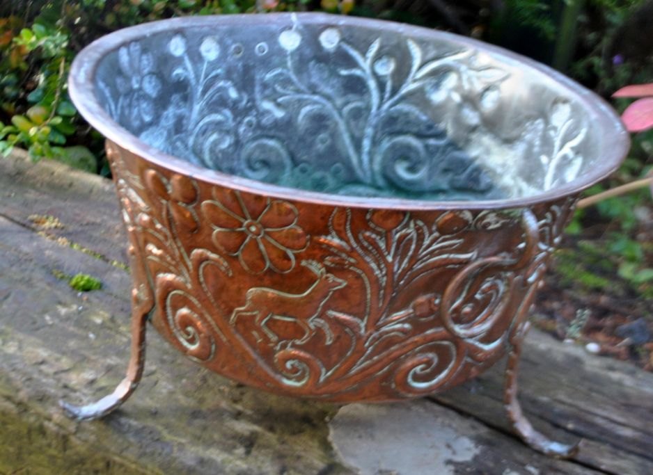Kupferner Blumentopf, 18. Jahrhundert. Dänemark. Gestempelt: 175?. Die letzte Zahl ist teilweise durch die Dekoration verdeckt. Mit drei Beinen und zwei Griffen. Mit getriebenen Dekorationen aus Blumen, Bäumen, Pferden, Vögeln und Hirschen an der Seite. H: 19 cm. Durchmesser: 32,5 cm.