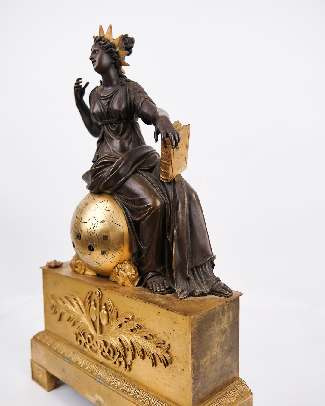 Text zugänglich auf Dänische: Fransk Kaminur - Bronze - Udsmykket Med Kvindefigur med strålekrone og bog - Paris - År 1820erne