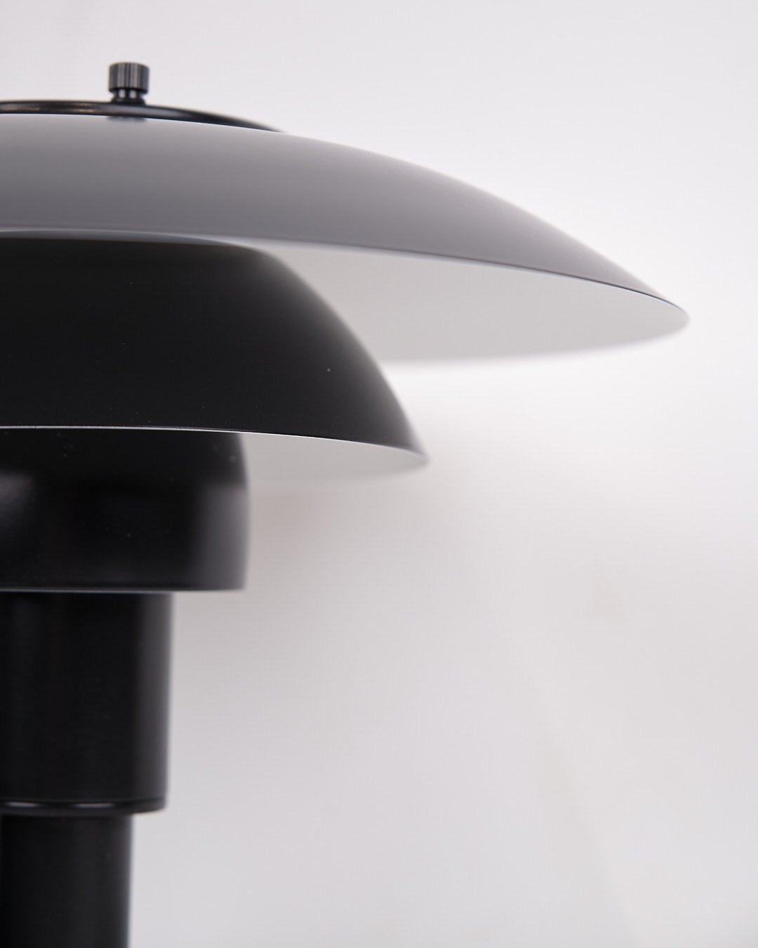 Text zugänglich auf Dänische: Klassisk PH udendørs væglampe, model PH 3-2½, designet af Poul Henningsen for Louis Poulsen. Lampen er udført i V2 sort og skabt med det ikoniske treskærmssystem, som sikrer et behageligt, blændfrit lys.