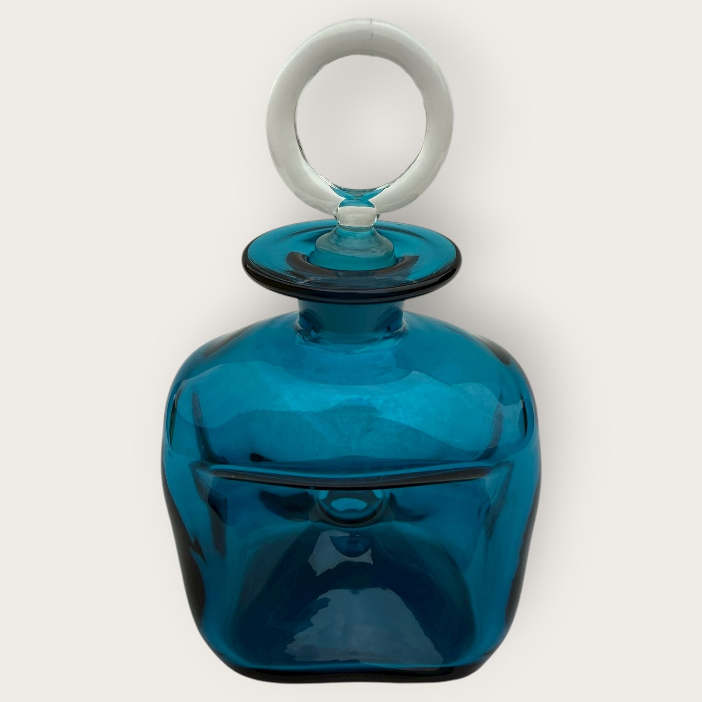 Kastrup Glashütte, Blaue Glucksflasche mit flachem, klarem Stopfen, 19 x 11 x 7 cm *schöner gebrauchter Zustand*