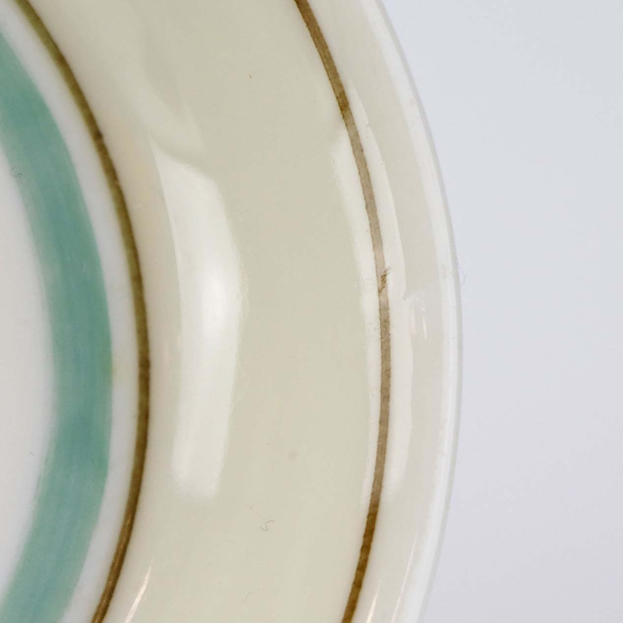 Service i glat cremefarvet porcelæn med grøn og sort kantstreg samt dekoration af blomster og grene i sort streg.