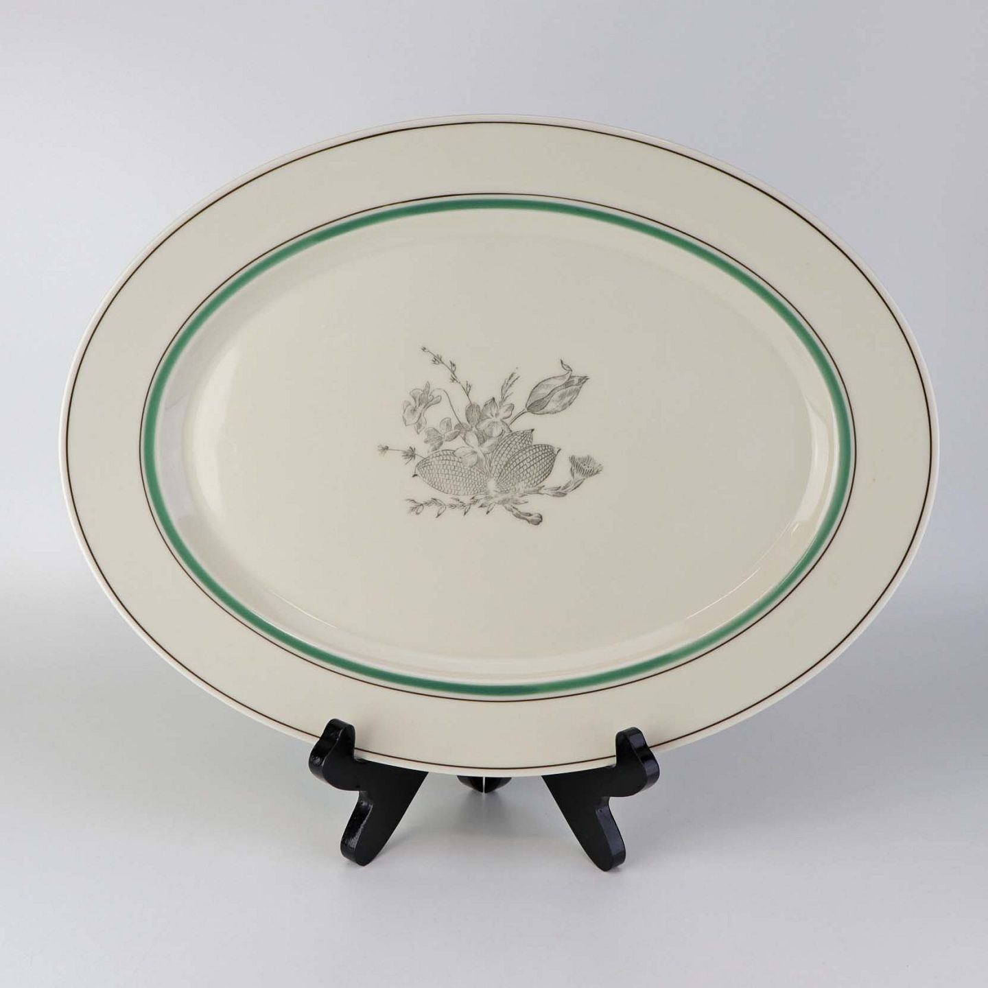 Service i glat cremefarvet porcelæn med grøn og sort kantstreg samt dekoration af blomster og grene i sort streg.