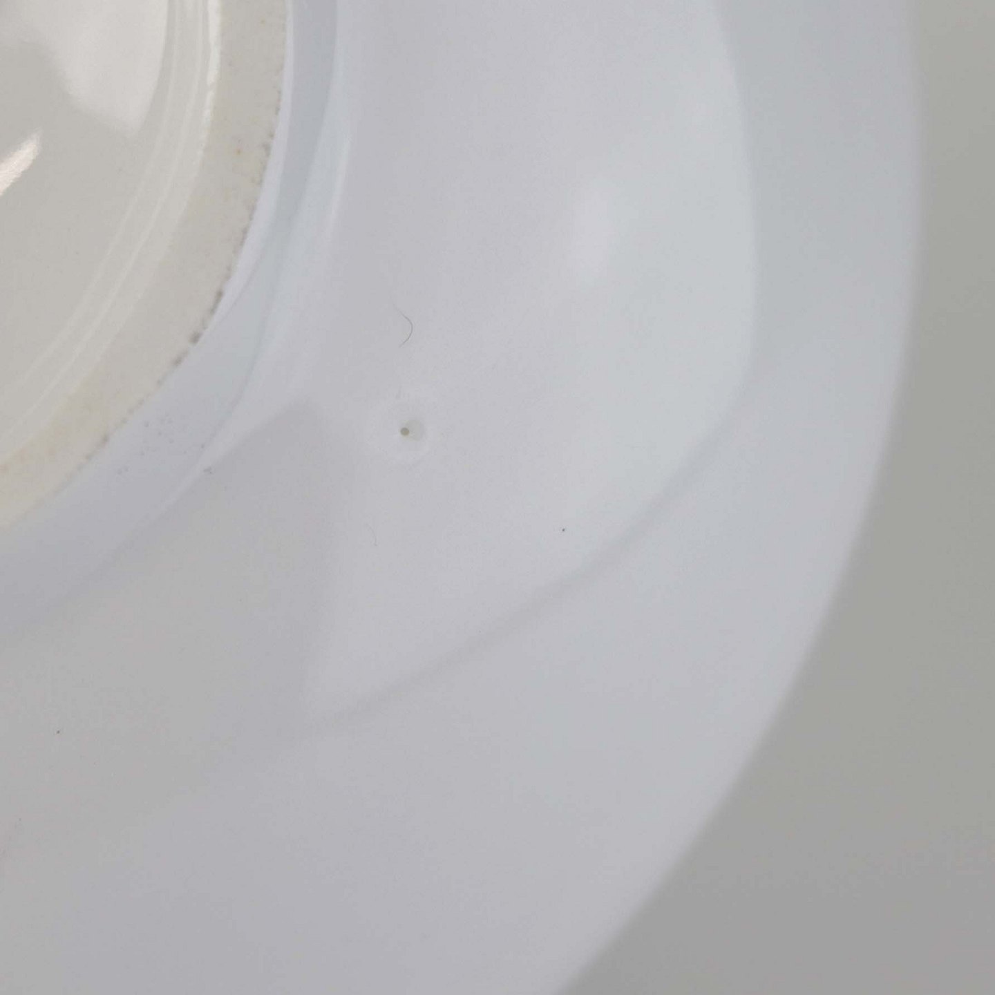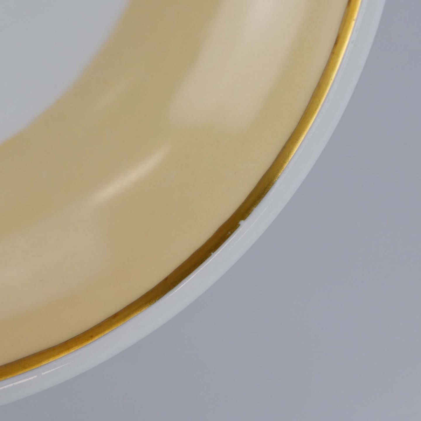 Fremstår med mindre brugsspor på guldkanten samt ujævnhed i porcelæn under bunden.