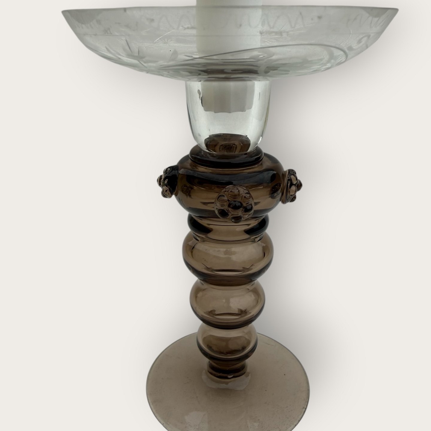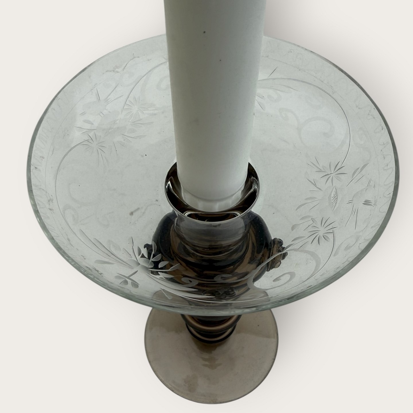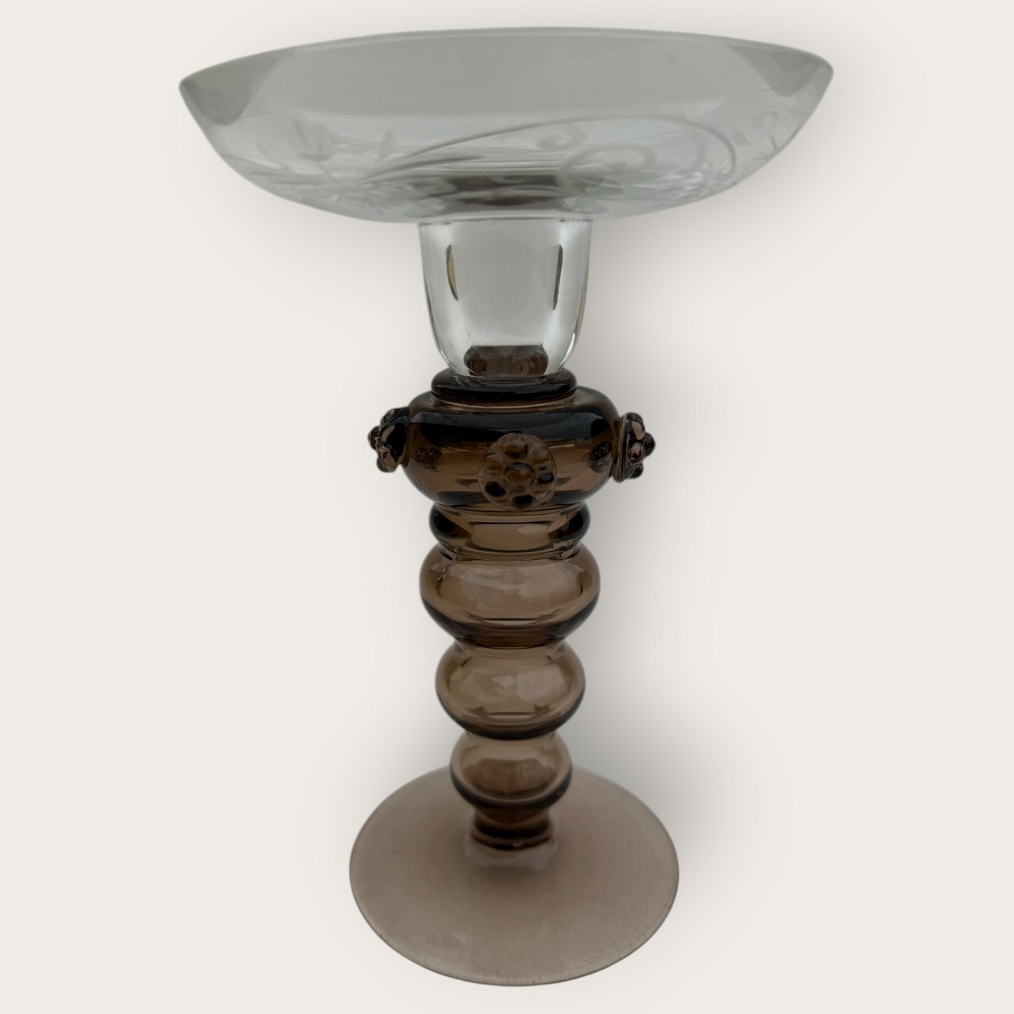 Alter Kerzenständer aus Glas, hohler brauner Stiel mit Rosetten, Schale mit Schnitten von Vögeln, Mustern und Blumen, schöner Zustand, Höhe 16,5 cm, Durchmesser 11 cm