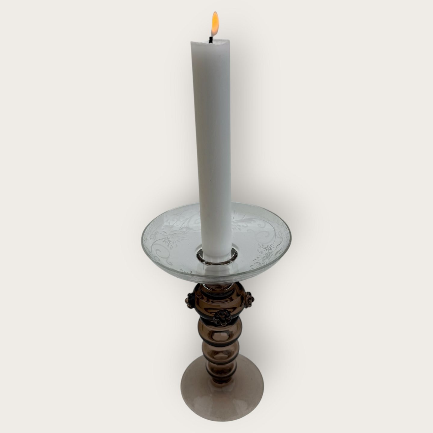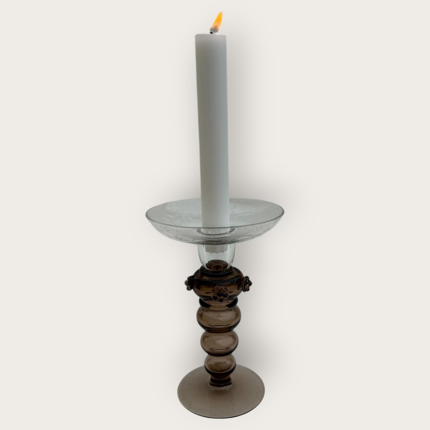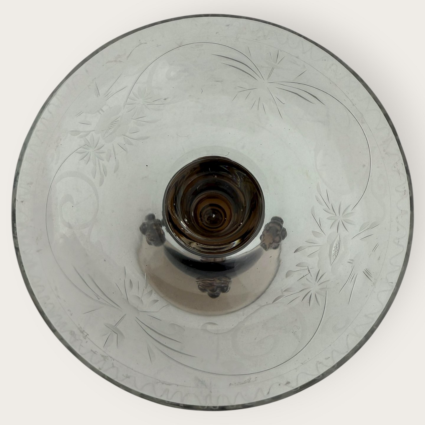 Alter Kerzenständer aus Glas, hohler brauner Stiel mit Rosetten, Schale mit Schnitten von Vögeln, Mustern und Blumen, schöner Zustand, Höhe 16,5 cm, Durchmesser 11 cm
