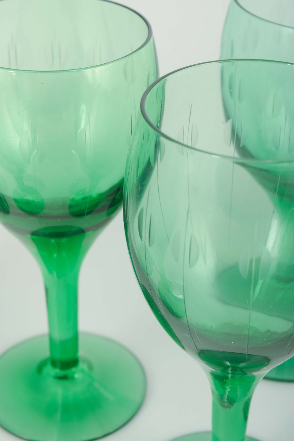 Sæt med seks grønne hvidvinsglas i det klassiske Kirsten Piil-design for Holmegaard. De elegante glas har en let organisk form og et smukt, transparent grønt farvespil, der giver et tidløst og stilrent udtryk.