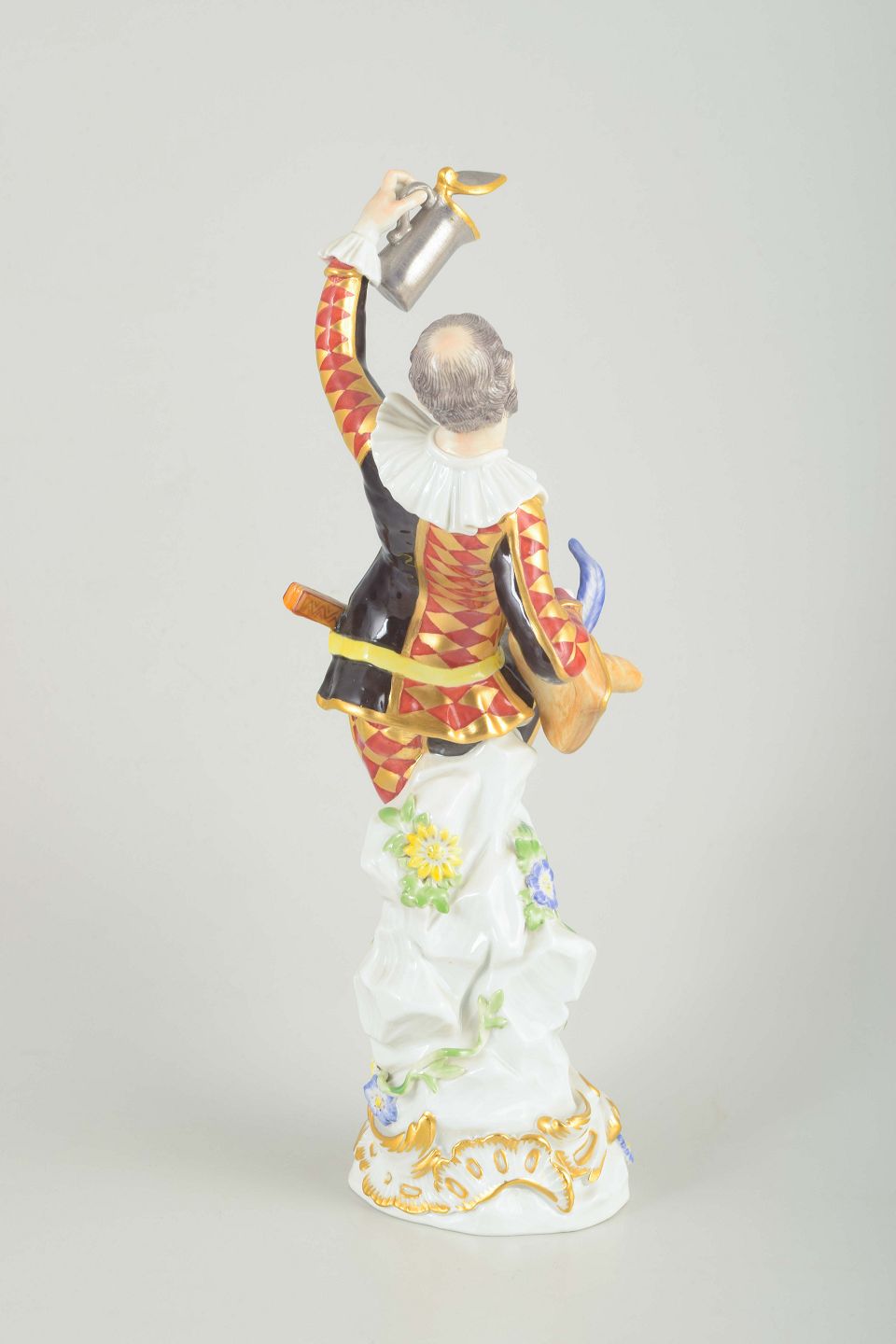 Pragtfuld og detaljerig porcelænsfigur af Harlekin i klassisk Commedia dell’arte-dragt, udført i de fineste farver med overdådig håndmalet staffering i rødt, guld og sort. Figuren skildrer Harlekin i festlig positur med løftet krus, rigt dekoreret med gulddetaljer og stående på en rokoko-inspireret base med blomster.